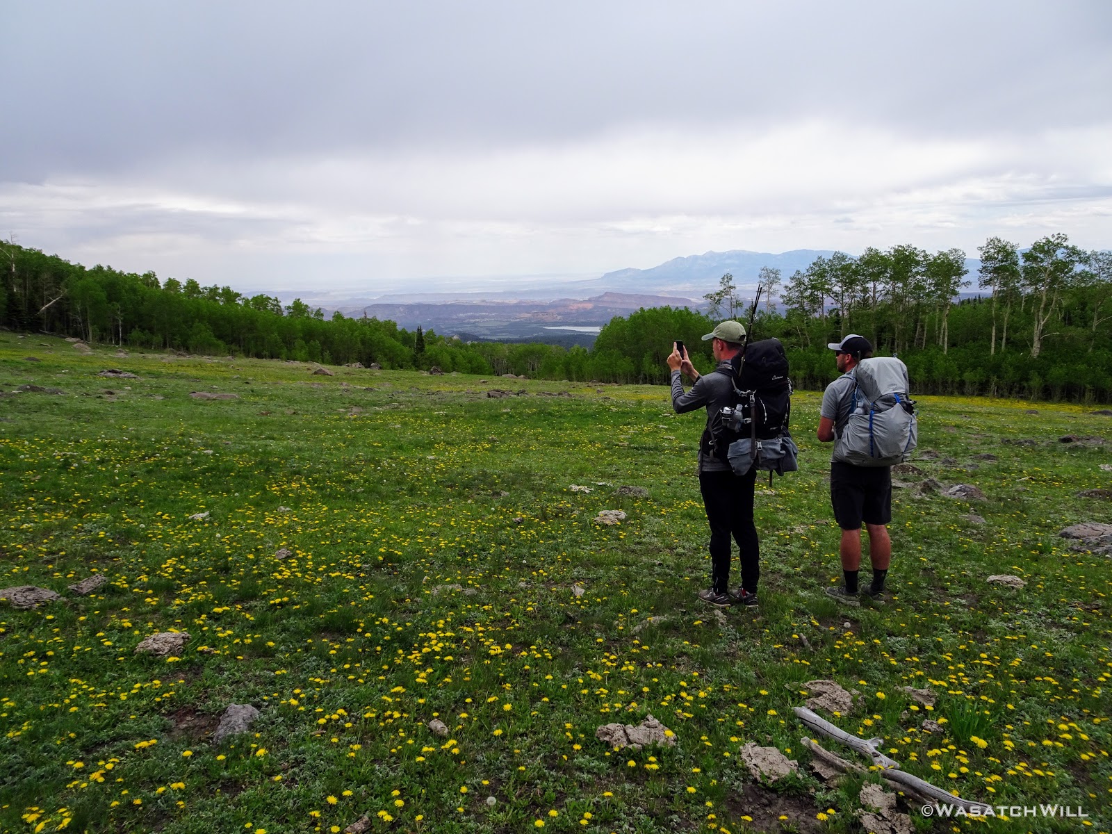 Our final day began with the skies more overcast. We had actually gotten a few light showers that passed over us through the earlier hours of the morning. There was no sign of the sun coming through to shine anytime soon, so we had to pack up wet tents and put on some apparel to shed the moderate but blustery wind blowing up into our camp and through the meadows. On our way out to finish out our route, I lead Dane and Devin back out to the overlook at the bottom edge of the meadow I had visited the night before.
