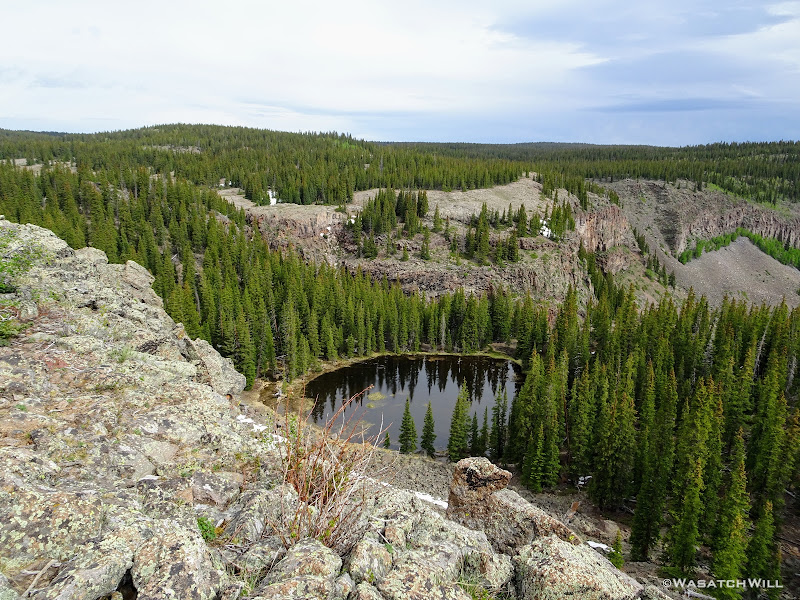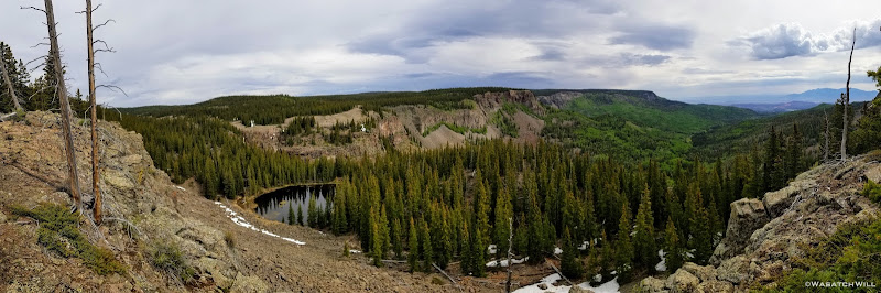 A couple miles mixed in with some more route finding brought us to yet another grand overlook along the edge of the rim. At this point, the weather started turning for the better as well, showing the promise of sunny skies to come. We enjoyed more views of the drainage we were ultimately circling around with this trip. A small nameless lake or large pond lied down below.
