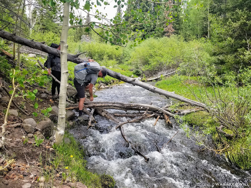 It would've been a pretty effortless crossing had we just dunked our feet right through it. But no...our instinct to keep our feet warm and dry caused us to come up with a more creative solution: throw some downed logs and branches across a narrow spot and give ourselves a bit of a bridge.