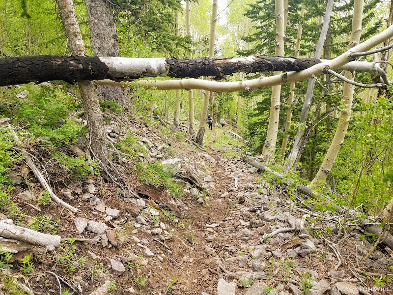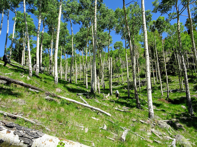 Along the way up to the rim, we'd pass through more groves of tall and vigorous aspens. These trees must have some stories to tell because they were obviously very old. Given their size, they're likely over 200 years old individually, and some sources suggest the root stock from which they spring forth from and which unites the individual trees into a single organism, may be up to 10,000 years old.