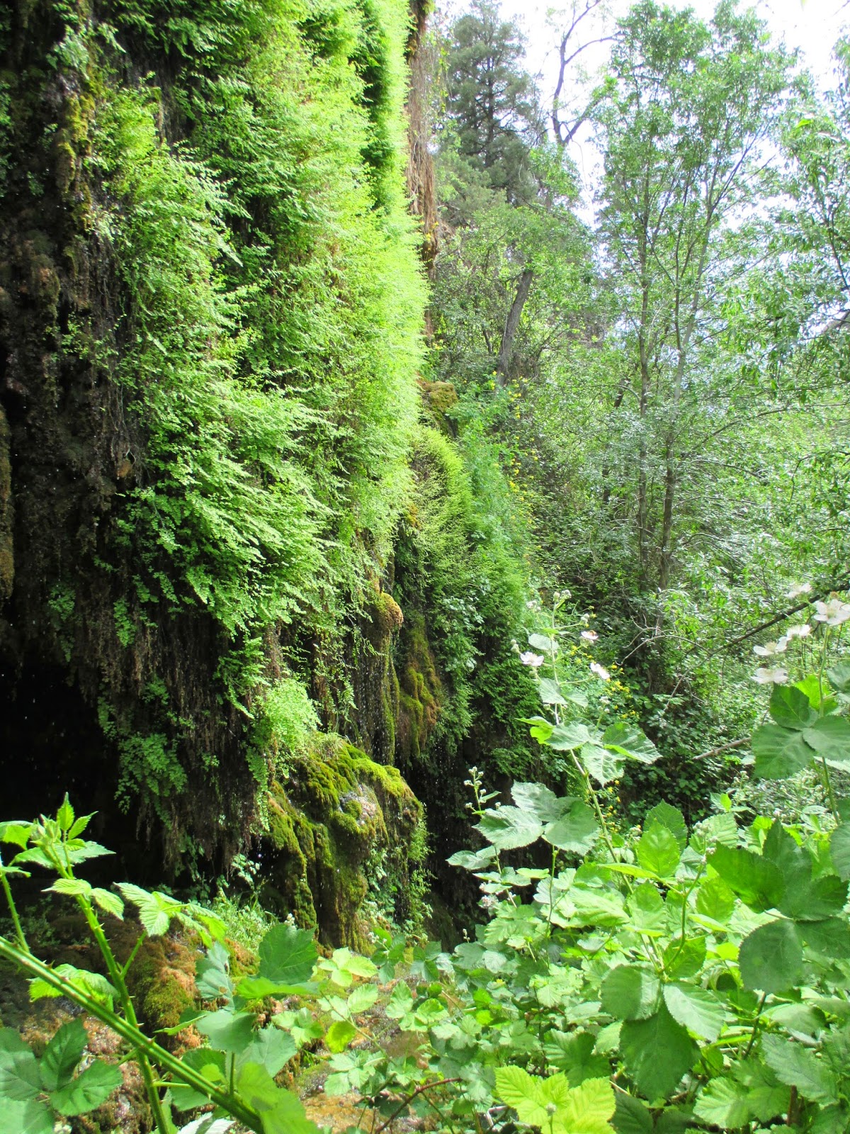 We then did the short "Waterfall Hike". The Waterfall Hike doesn't really have a waterfall on it. Instead it's a lush green travertine cliff that's seeping full of water and covered in ferns, mosses, columbines, and other plants. It's neat, but definitely steep stairways to climb. There were a lot of wild blackberry plants that made me think that late summer might be a good time to visit here. We definitely had a good time at Tonto Natural Bridge.