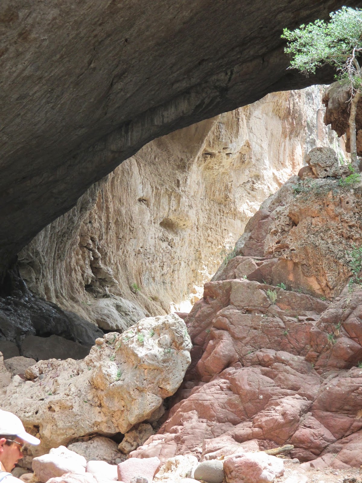 As we were picking our way over the rocks and boulders, we found a sign with an arrow pointing the way, then another one, and pretty soon we found ourselves underneath the bridge. Every time we lost the wayfinding signs, we'd look a little harder and find another one soon enough. Pretty soon, we'd climbed all the way through the bridge and were on the other side. The signs on the downstream sign warn hikers to not climb in the upper caves, or swim in the pools underneath the bridge.