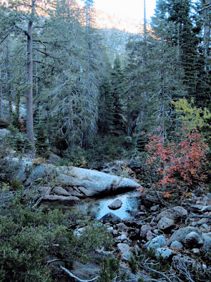 We stopped at a glorious granite plateau by the creek, refilled out water bottles, and started to hike uphill back to camp. On the way back Tom, who had never been down the canyon before, led the way so that we could get a fresh pair of eyes on the trail. We found a few places where it wasn't clear, and did what we could to mark it better.