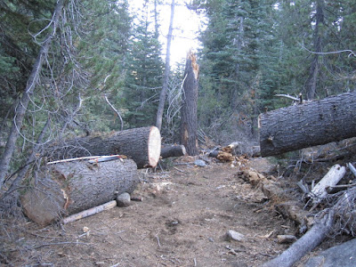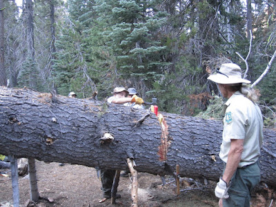 By 1:30 we were at the first major obstacle of the trail: a massive tree that blocked things from the far side of the river to the granite cliffs on the other side of the trail. And since the only way to get past it was to get on your hands and knees and crawl under it, this one had to go. Ranger Chip had been there some weeks before, but had been unable to cut through the monster. In fact, he'd had to leave two wedges stuck in place in the saw cut. The damn tree was still alive, with some of its roots drawing water from the creek, and the wood expanded around every cut and wedge.