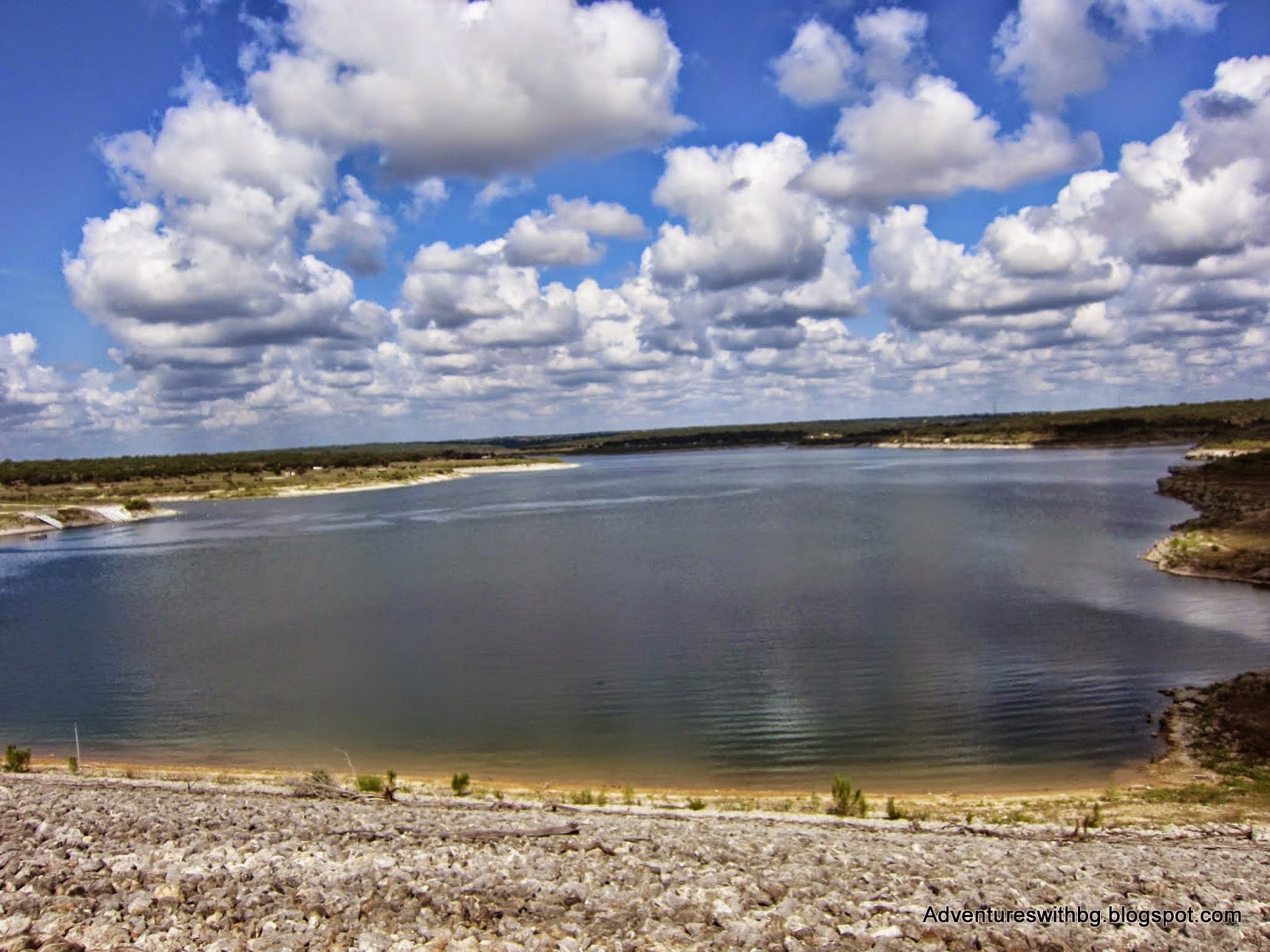 We started across the dam, which was a wonderful view of Lake Georgetown and the surrounding area. However, we were in direct sunlight and on asphalt and BeeGee over heated quickly. We made it across the mile long dam as quick as possible and found the only tree with any shade so BeeGee could cool down. After that, it was about a mile walk on a paved road back to our cars and the end of our trip.