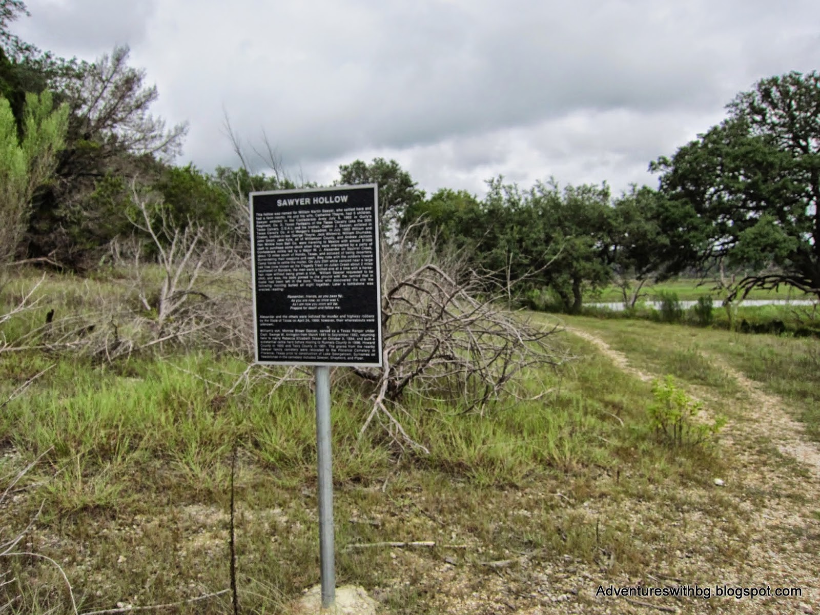 After a short break BeeGee, Dustin, and I continued on our journey. We crossed over the San Gabriel just after Tejas. The next section had placards where nomadic tribes had camped and had cooking areas. Moreover, as we traveled back toward the lake it was parallel to the San Gabriel through grasslands and a portion was on an old doubletrack road. This section was some of the easiest hiking we did on the trip. Just after mile 12, there is an old concrete water crossing called Box Crossing. We headed down and filtered river water. The river crossing has a placard explaining its origin and states mile 14 is just ahead, it’s not true and mile 13 is still a decent walk away.