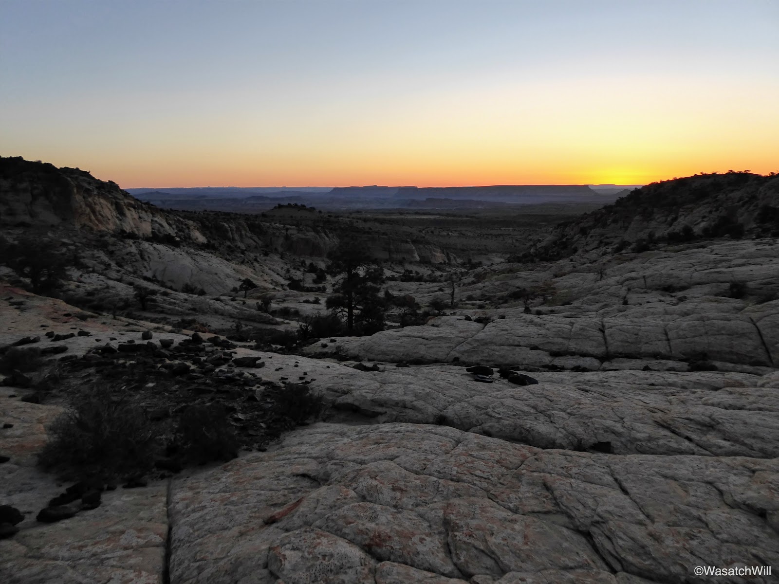 I selected a fairly level slab of slickrock just wide enough to accommodate my Tarptent. Being a non-freestanding tent with no way to use stakes here, I resorted to anchoring my tent with large rocks. It was quite breezy and I was concerned about the rocks being enough to hold if it got much windier through the night, but it turned out really well.