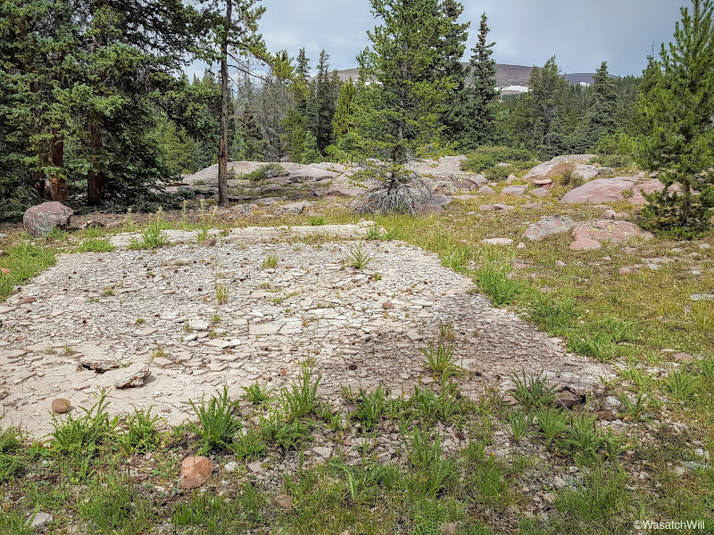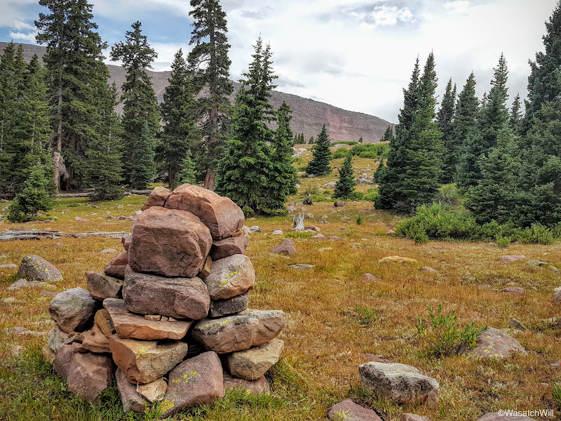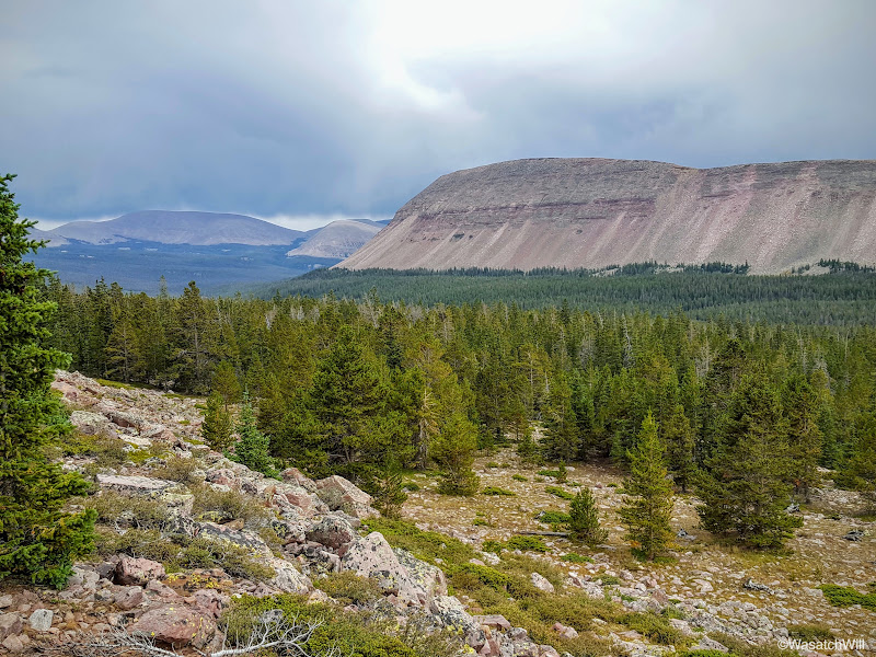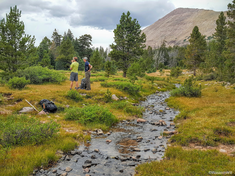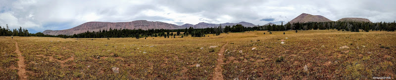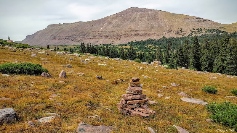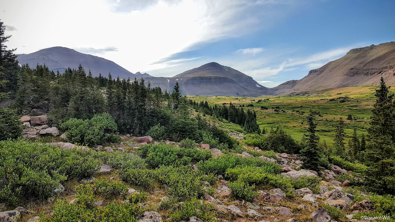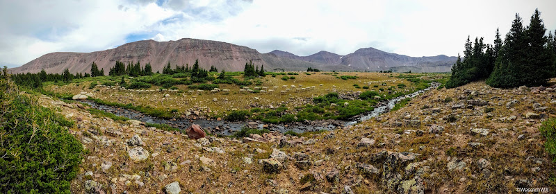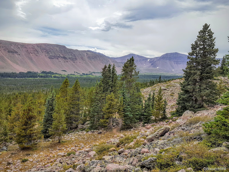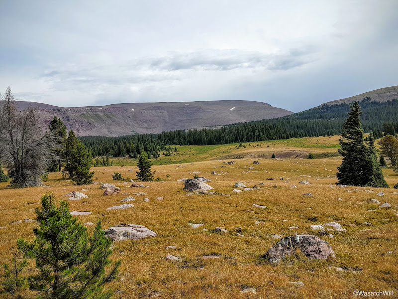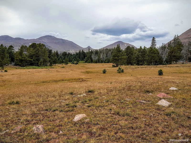 In due time, we arrived at the edges of Painter Basin. There we saw the camp of another older couple out doing some exploring that we had encountered further back on the trail. The trees thinned out and quickly gave way to some wide open meadows and flats offering up some of the better panoramic views of the day, despite the gloomy sky. Kings Peak and its ridge line graced the horizon.