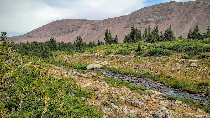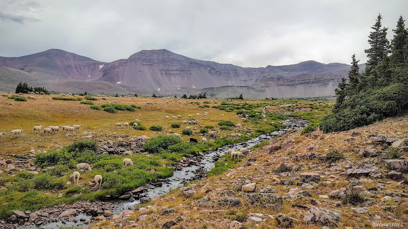 Sheep parade. Trail Rider Peak (left), Painter Peak (middle), and 2nd Gemini (right) above.
