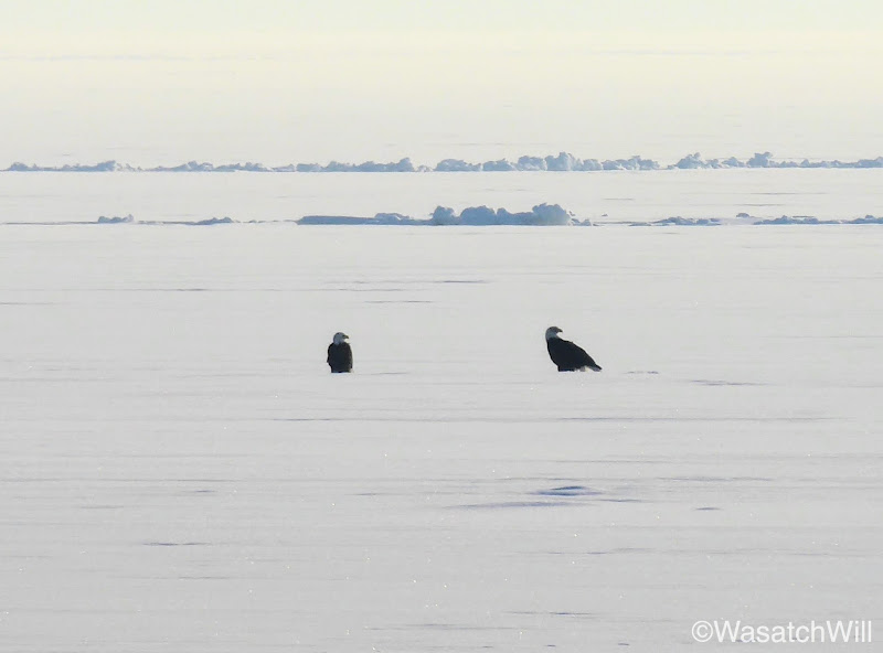 Then we saw some other big birds out flying over the ice in the vicinity. They soon landed and after zooming in on them out in the distance, it was evident that they were indeed adults. Bald eagles will pair off and mate for life, so I assumed this was a pair and the juvenile nearby may well have been theirs, making them all a family.