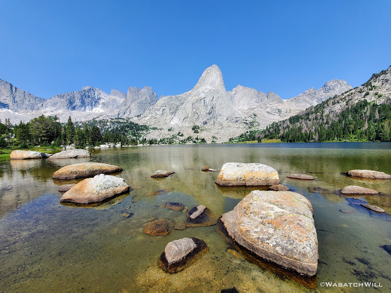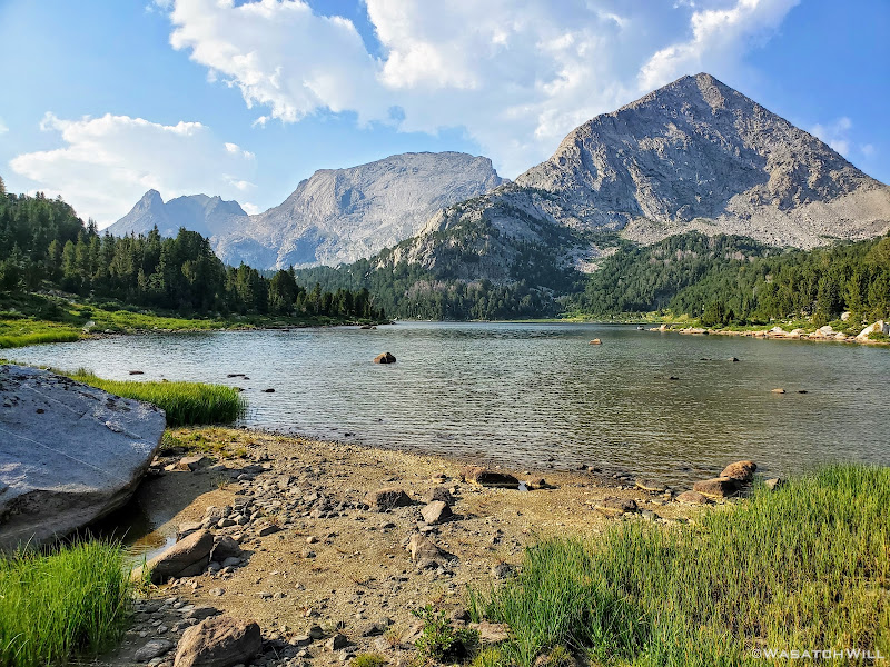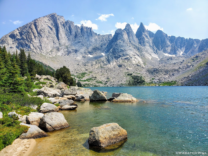 At Shadow Lake, we found ourselves a nice shady spot to pull into for some refuge from the hot sun that had now been beating down on us. Nearby a group was camped out and in another couple spots nearby some other groups moved in for the evening. Still others would pass on by. We enjoyed a nice long rest while fueling back up with some lunch all while being treated to a nice view of the back side of the Cirque of the Towers, including: Bollinger Peak, Wolfs Head, Overhead Tower, Sharks Nose, Block Tower, and Watch Tower.