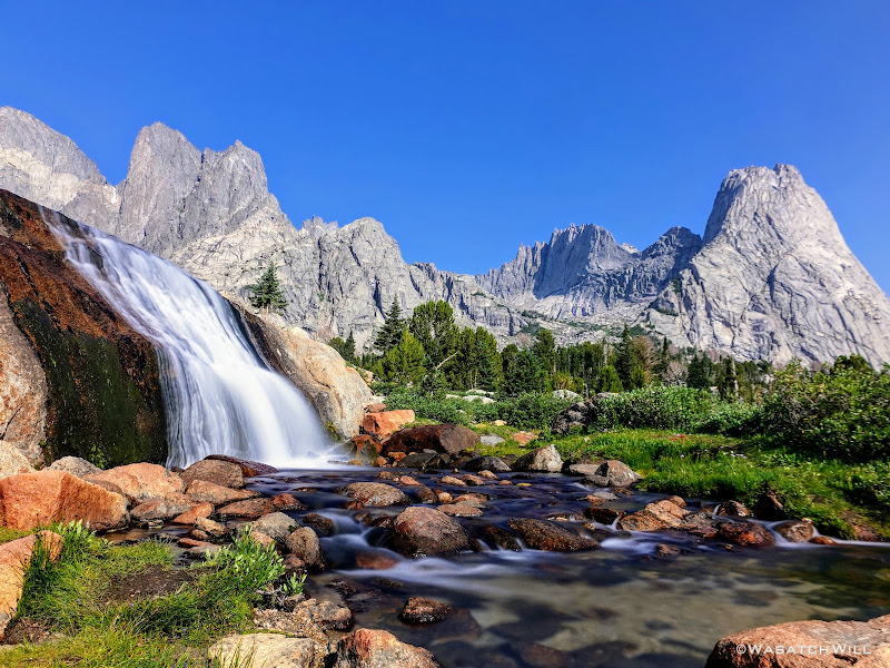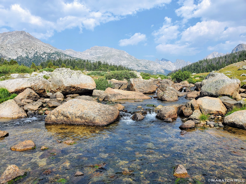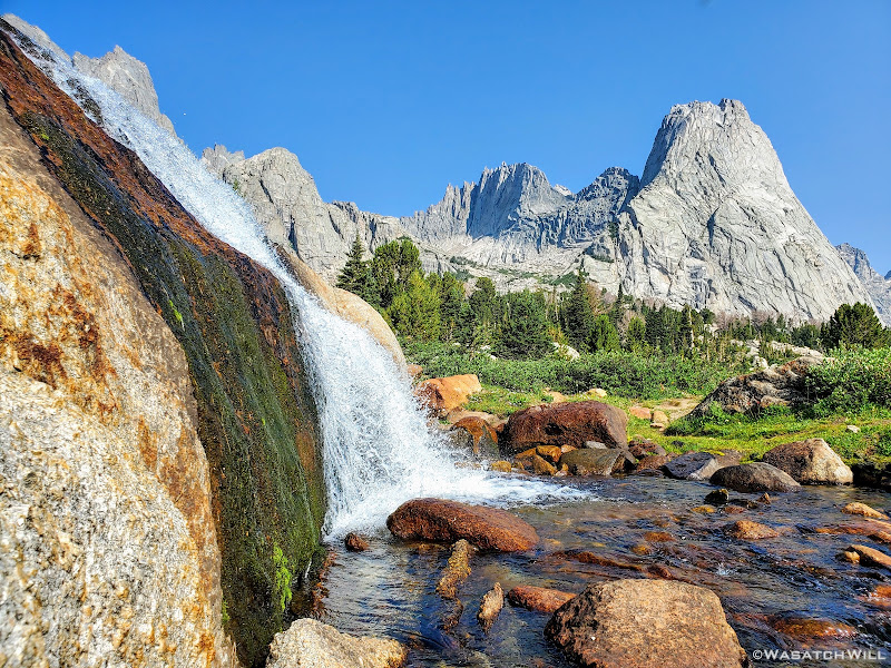 Washakie Creek with Mount Washakie, Bair Peak and west face of Cirque of the Towers beyond