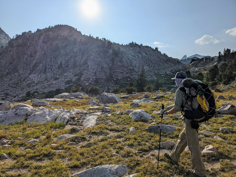 Once at Pyramid Lake we turned our attention to East Fork Park, er, Desolation Valley. We'd now be departing what had been a mostly official, well established, and well maintained trail to this point in our route since we had left the trailhead the prior day. From now until we reached Middle Fork Lake later on the morrow, we'd now be left on our own to navigate off trail making use of unofficial use trails as they appeared in spots wherever we could find them. Elsewhere we'd have wide open tundra to walk across and some long fields of rocks and larger talus to pick our way through.