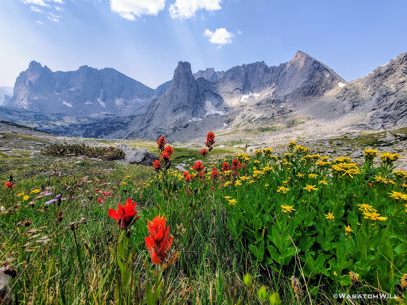 Paintbrush (red) and Arnicas (yellow) grace the grassy slopes of Texas Pass