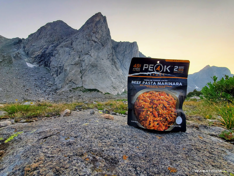 Once our tents were up we settled down behind a rocky protrusion alongside of our camp that served as a very nice back rest. Of course, now sitting beneath the amazing Ambush Peak, it was only fitting that I pull out a prized Peak Refuel brand meal for dinner. Beef Pasta Marinara. It was hearty and delicious. Yum.