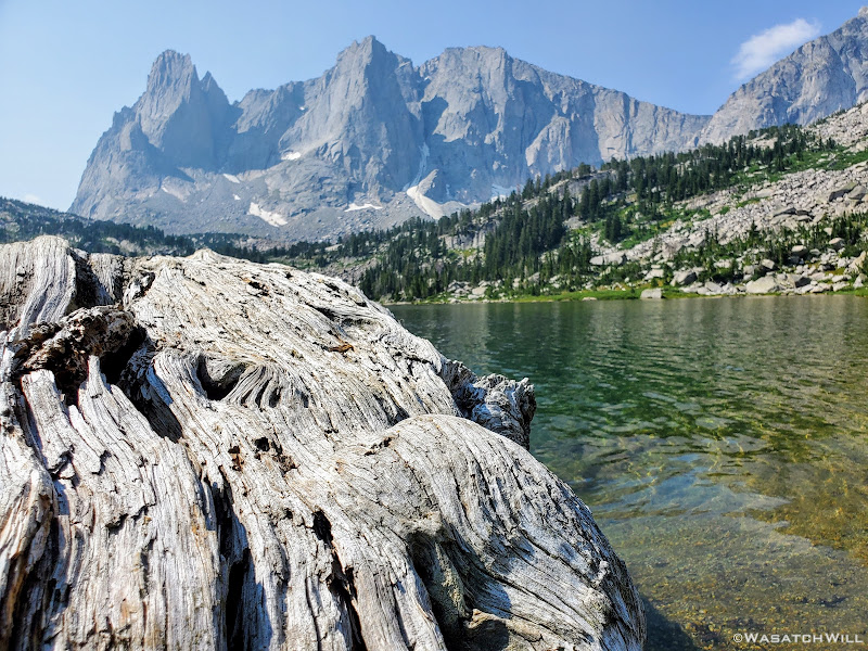 Log at the shore of Lonesome Lake, Warbonnet and Warrior Peaks above