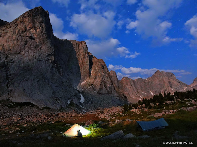 Now dark, I snapped up another long exposure of our camp before slipping into my tent to officially close out day two. This had been another location I was very much looking forward to camping at. As excited as I was to see the Cirque of the Towers and wake up there earlier in the morning, for some reason, I was even more excited for this spot. Needless to say, I was thrilled and overjoyed to be here on this eve and very much looked forward to seeing how the coming morning's light would make this area look.