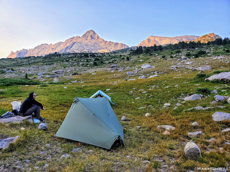 After a brief descent down off the ridge, we settled into a flat little grassy area tucked up above and between two of the local lakes. Nearby stood a stand of short trees, but still plenty high and sturdy enough to hold our Ursack bear bags for the evening.