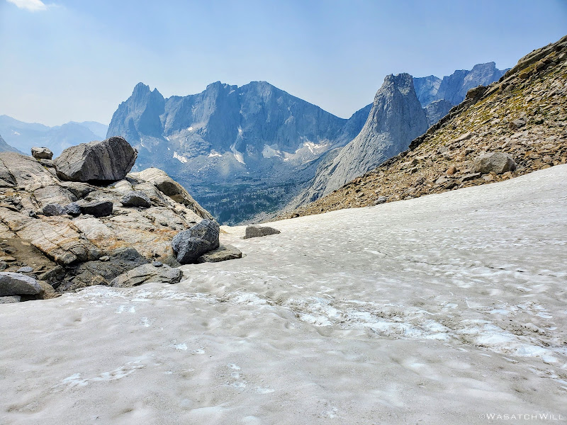 Right before cresting over the top of the pass, we had a snowfield to cross. It was soft with a gentle grade and plenty of footprints that had beaten down a track, altogether squashing any temptation to put on micro-spikes.