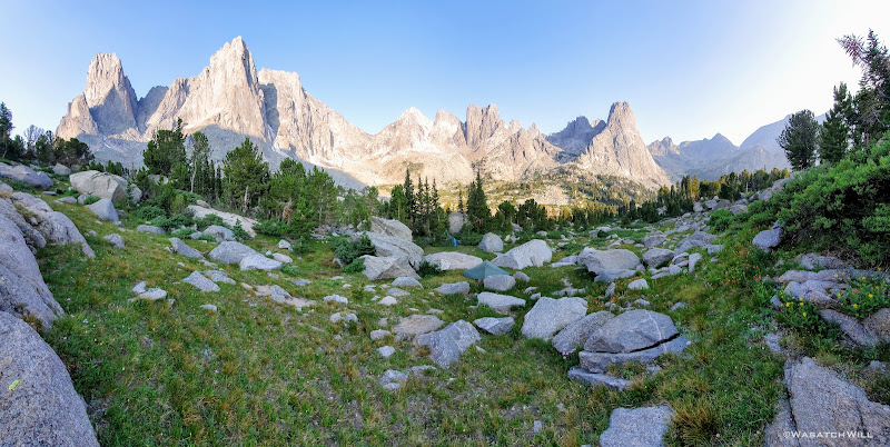 The sweeping panorama view we had from camp featured from south to north: Warbonnet Peak, Warrior Peaks, Pylon Peak, Watch Tower, Block Tower, Sharks Nose, Overhanging Tower, Wolfs Head, Pingora Peak, Camel Hump, and Lizard Head Peak.