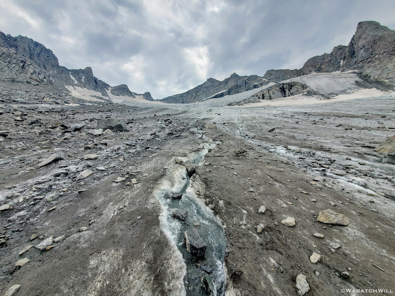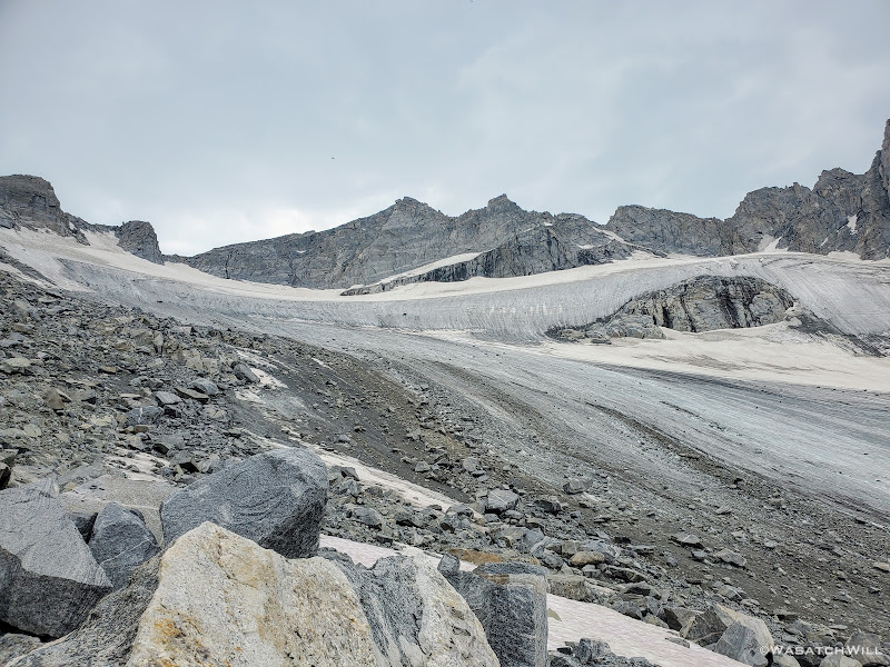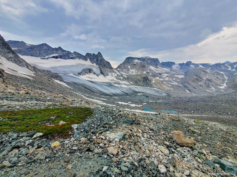 Once we had started drifting further away from Alpine Pass, the terrain became more and more crumbly beneath our feet. In between and under all the talus was very soft and loose and muddy moraine silt and other debris left behind from the receding glacier up ahead. It was not nearly as stable feeling as the moraine remnants we had recently come across just prior to coming over Alpine Pass. We had to be extra cautious and careful with our footing because the rocks across here were not nearly as stable and secure making the terrain ripe for a rolled ankle myself or worse.