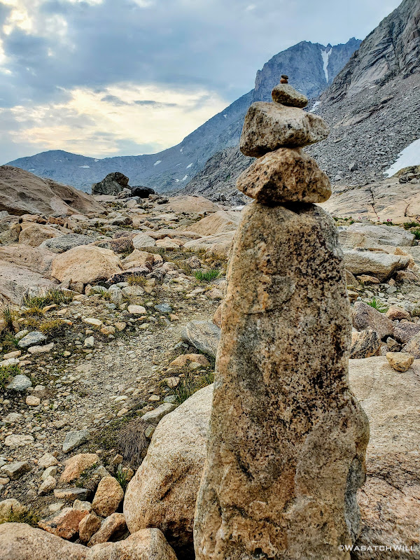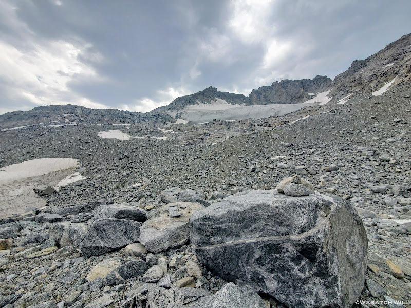 Once we hit the moraine we took a line of more gradual descent down to even more stable and level rock down below that served as a bridge along a ridge over the lower half of the moraine. Along that ridge would also be yet another stretch of snow to cross over. As we got back down into the rocks a couple cairns appeared. Cool! Or not...