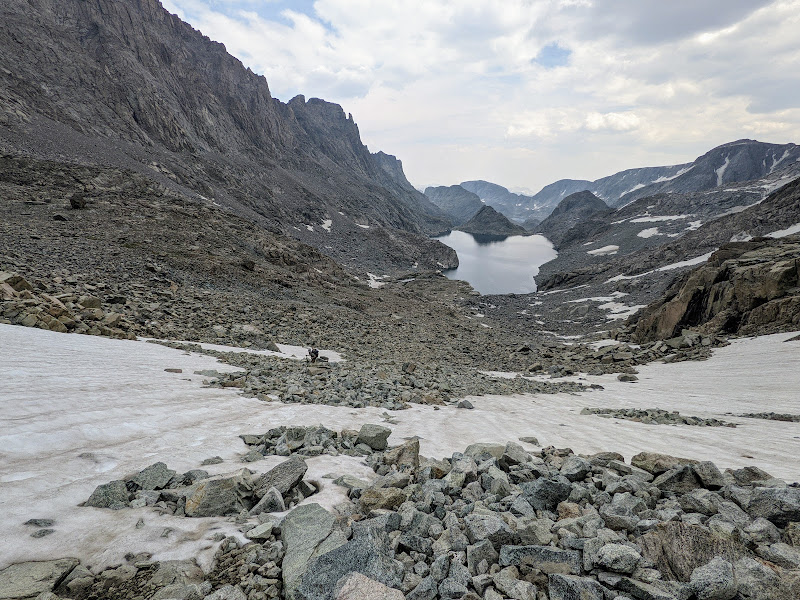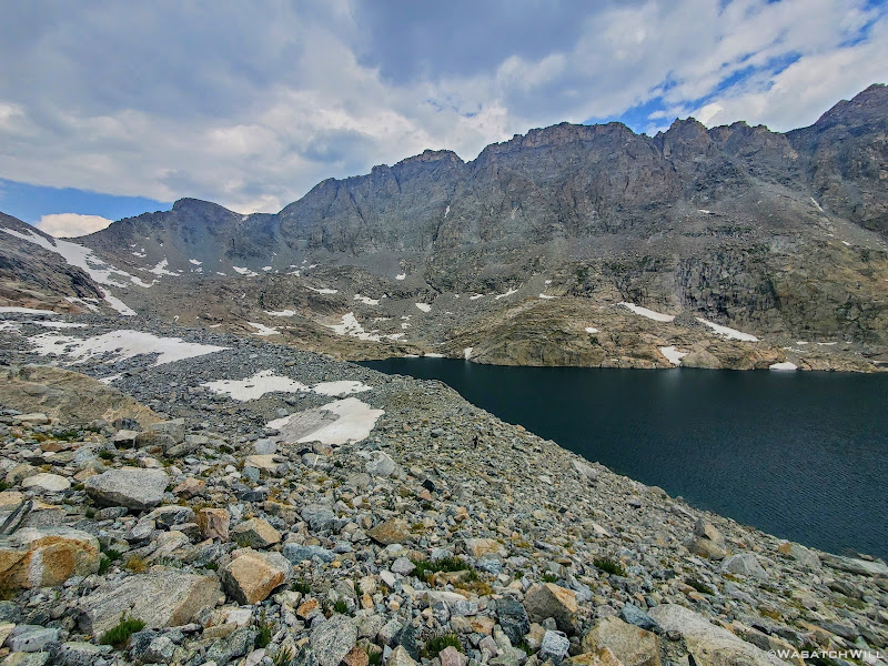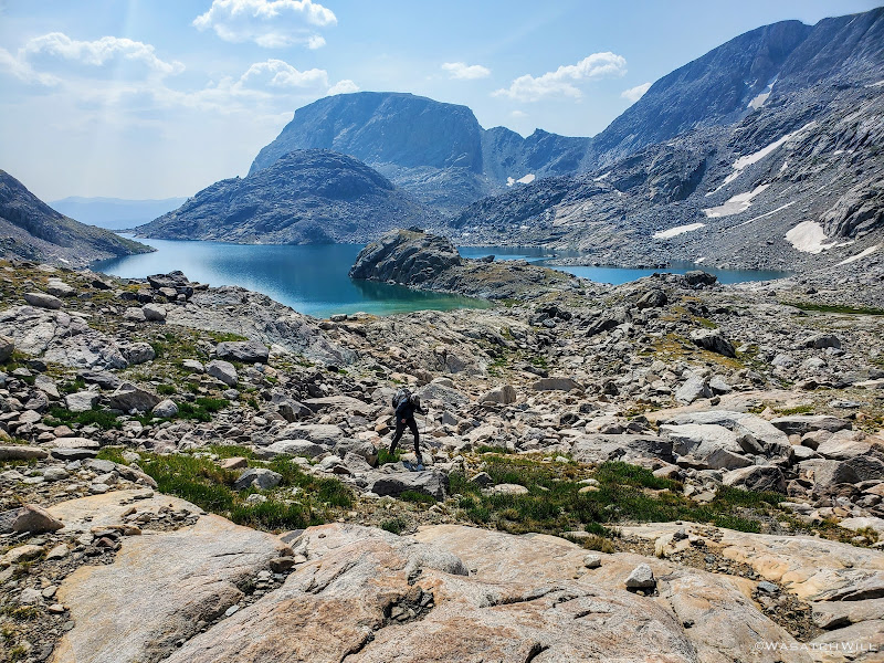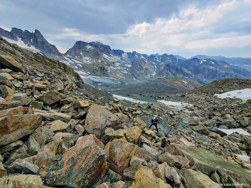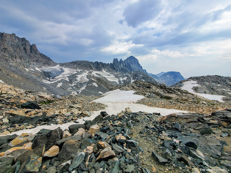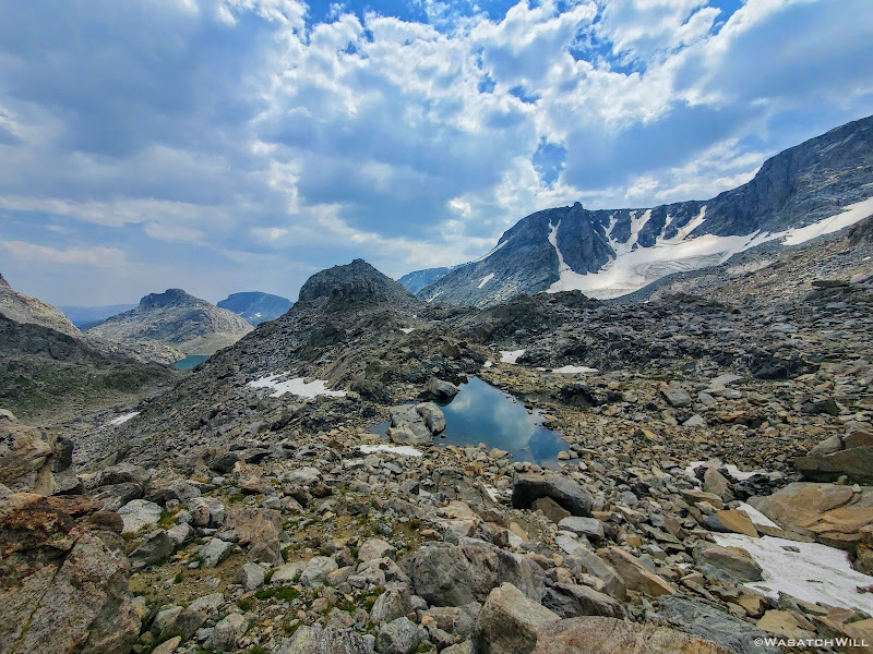 Scramble over talus, climb up a rise, go around a lake, traverse across snow or ice,...wash, rinse and repeat. Such was the pattern for much of Day 5 along this Wind River high route.