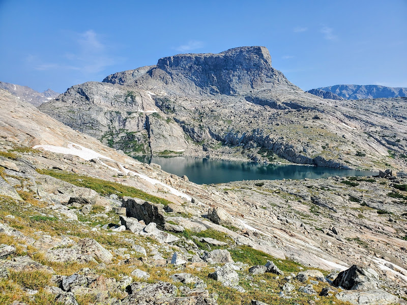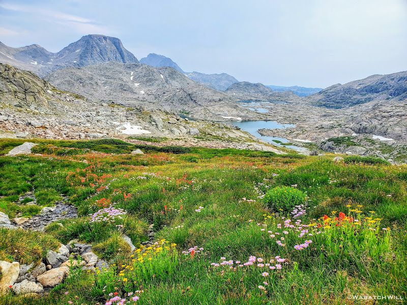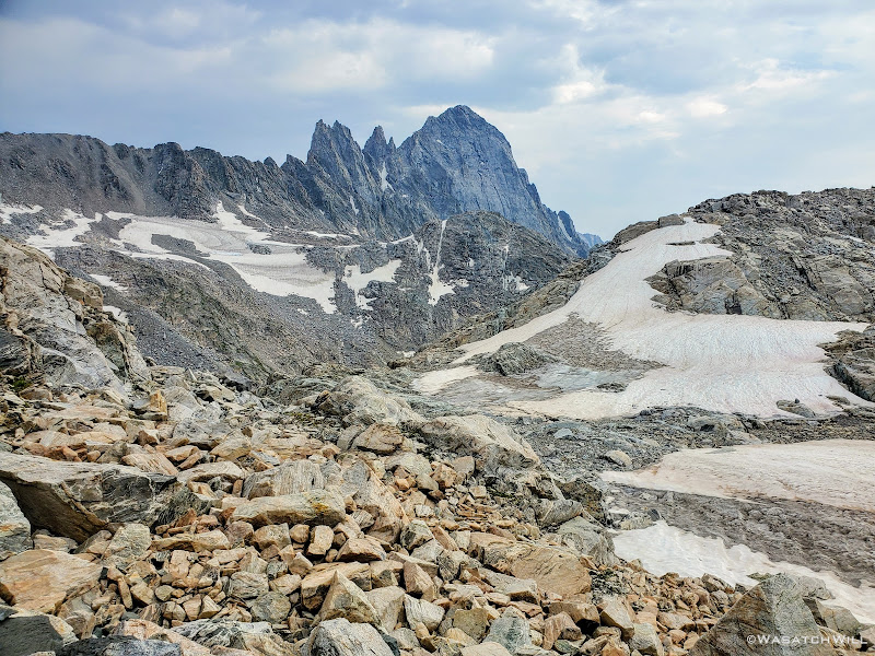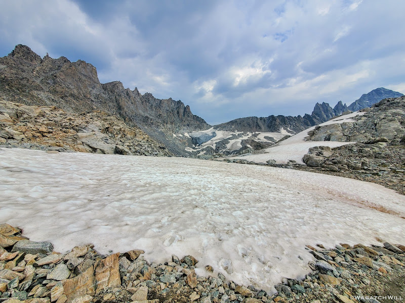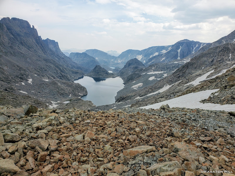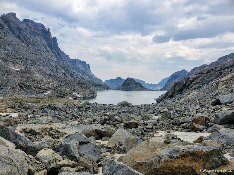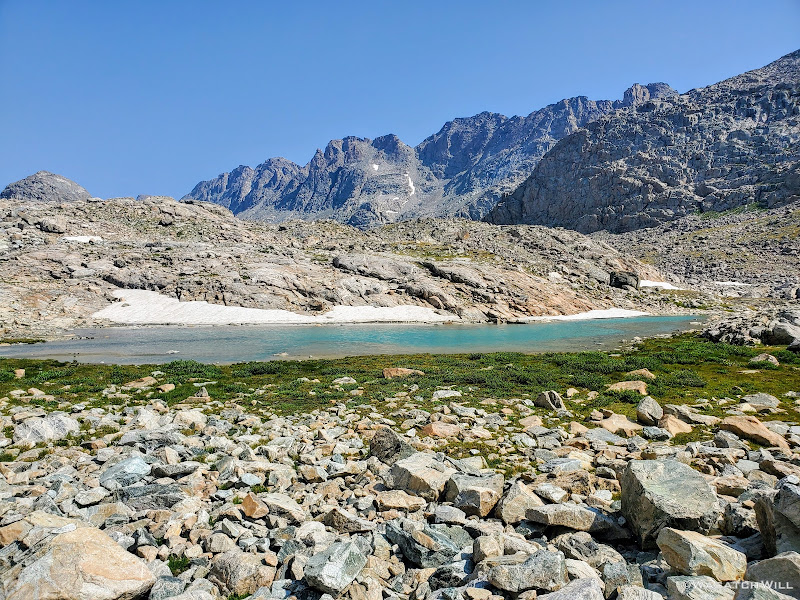 Scramble over talus, climb up a rise, go around a lake, traverse across snow or ice,...wash, rinse and repeat. Such was the pattern for much of Day 5 along this Wind River high route.