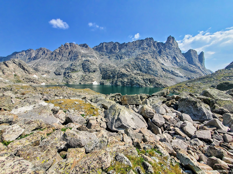 View of Lake 10813 beneath Harrower Peak (left) and Elephant Head (right)