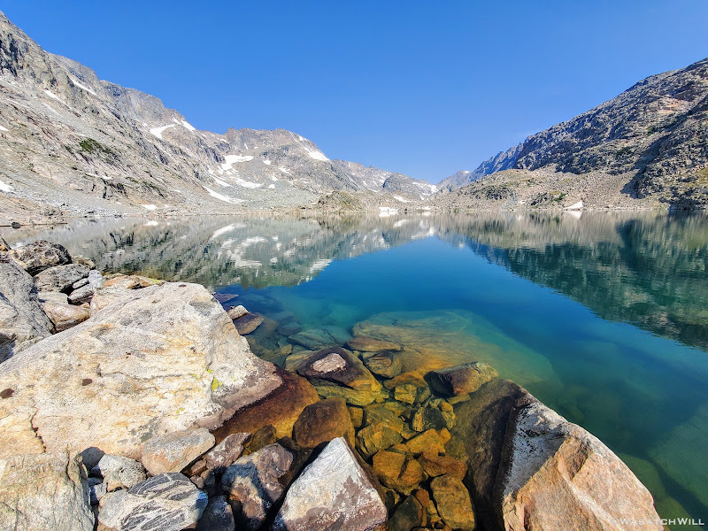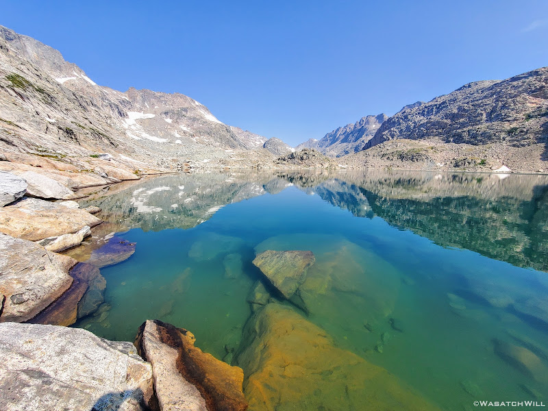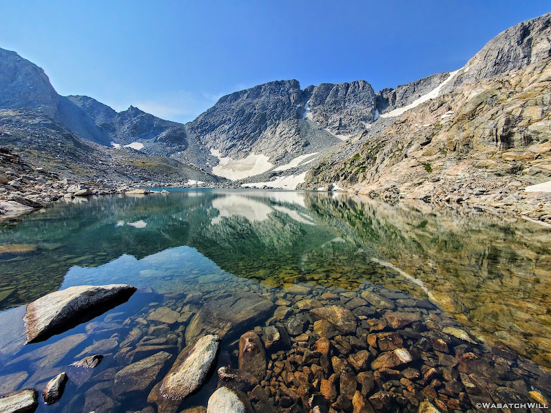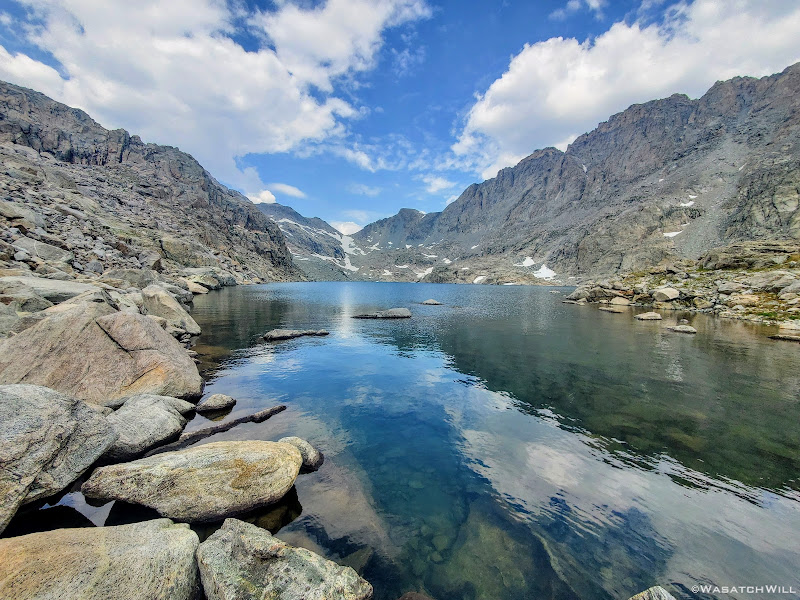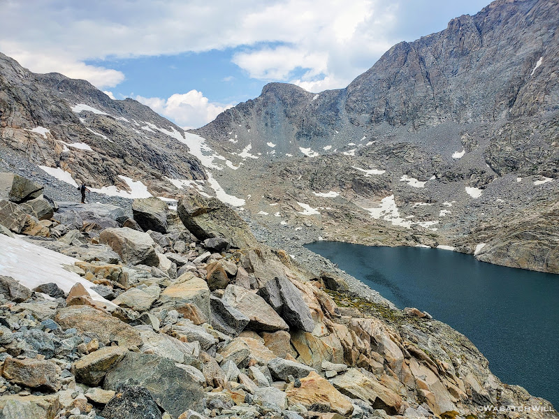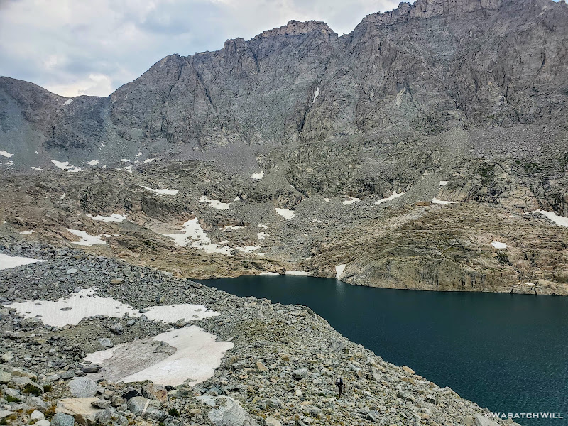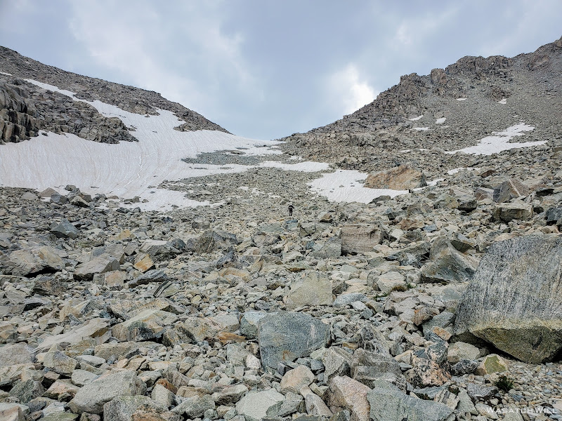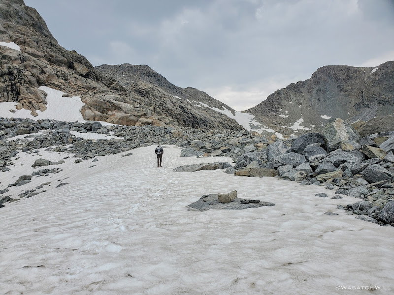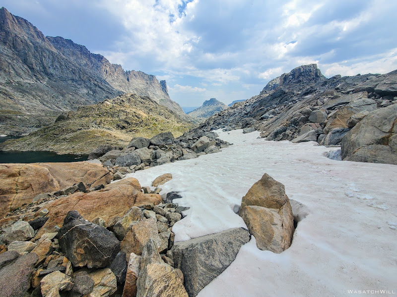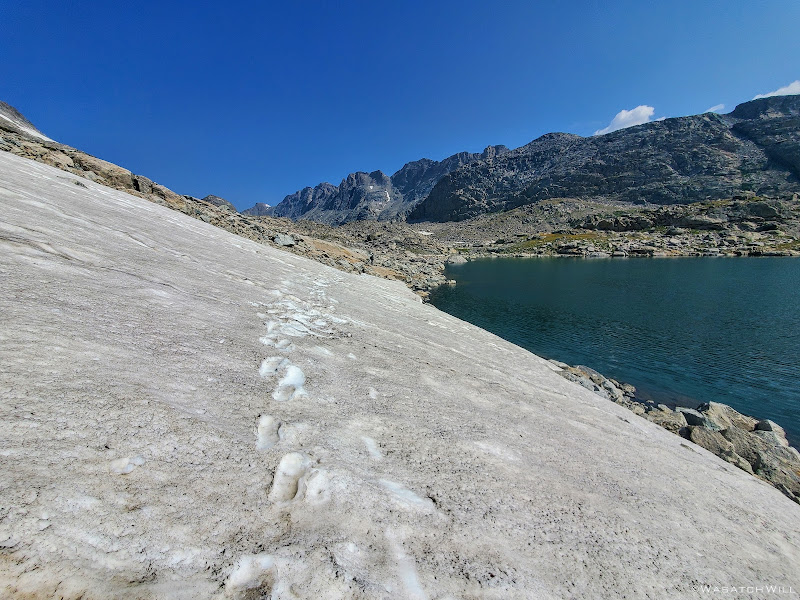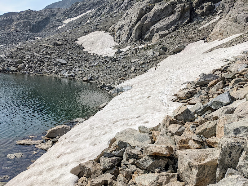 Getting around the first big lake was not too terrible. It was really just long and monotonous hopping over more typical talus only interrupted by one brief snowfield to cross over. The snow had just enough time under the morning sun to soften up enough and allow good footholds on it. As usual, extra care was required getting on and off of it. I have found that the edges of snowfields and drifts laying atop a pile of talus, such as this one was, are usually the softest and most dangerous at their edges where the potential and risk for post holing, falling through, and jamming your foot/leg into the rocks underneath is much greater.