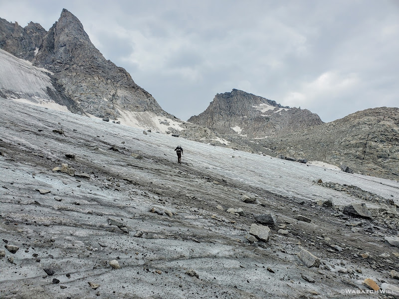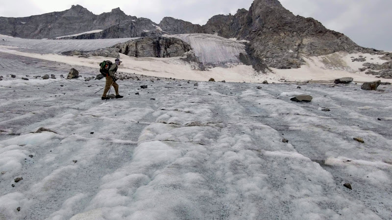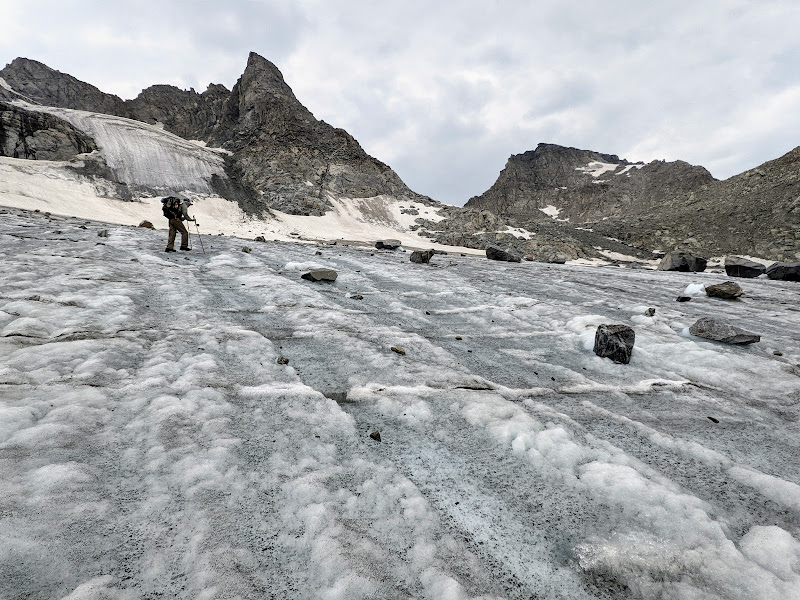 With Blake having left his microspikes back at home, we had been wondering how hard or how tricky it would be to traverse up and over the glacier without any such traction aid under his feet. We knew that with enough sun, the surface would probably be slushy enough to get reasonably good footing without any kind of traction accessories underfoot, but even so, it would be very inefficient. We knew of others who had successfully done this in favor of not carrying the weight of microspikes, crampons, or the like with them. Yet others have not only packed along spikes or crampons but ice axes and helmets as well only to have never really used them along the whole route. I suppose one can never be too sure if heading out in the early season or after a big snow year and it's always better to be safer than sorry. As already mentioned earlier in this series, I had reasoned that spikes, or in my case, some Hillsound Trail Crampons could prove useful and make the snow and ice travel more efficient and so I justified the extra weight of them. I also figured that my trekking poles would be sufficient as hand supports to help keep myself upright, providing additional assistive traction and thus further secure my footing.