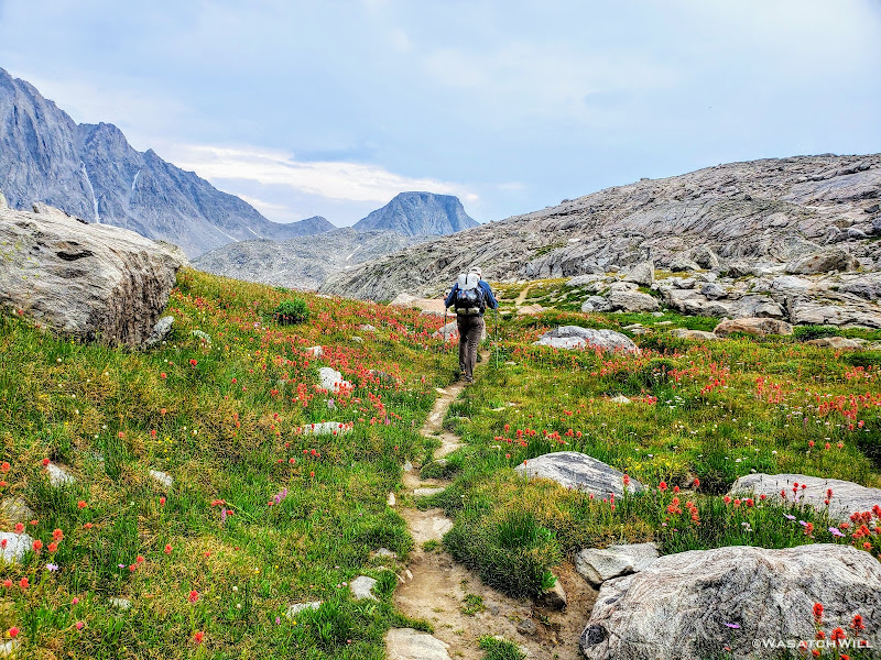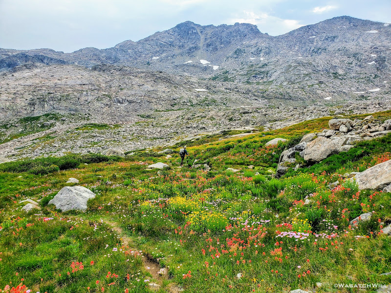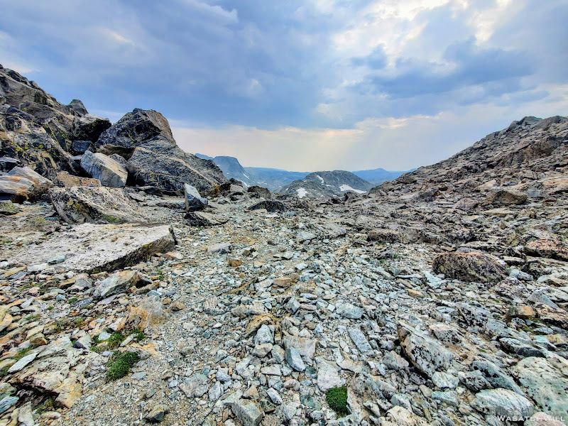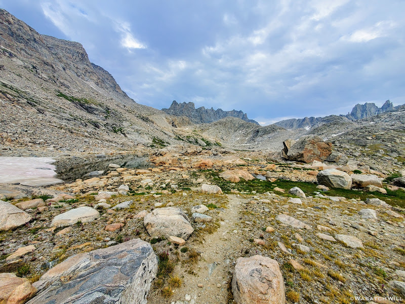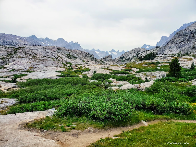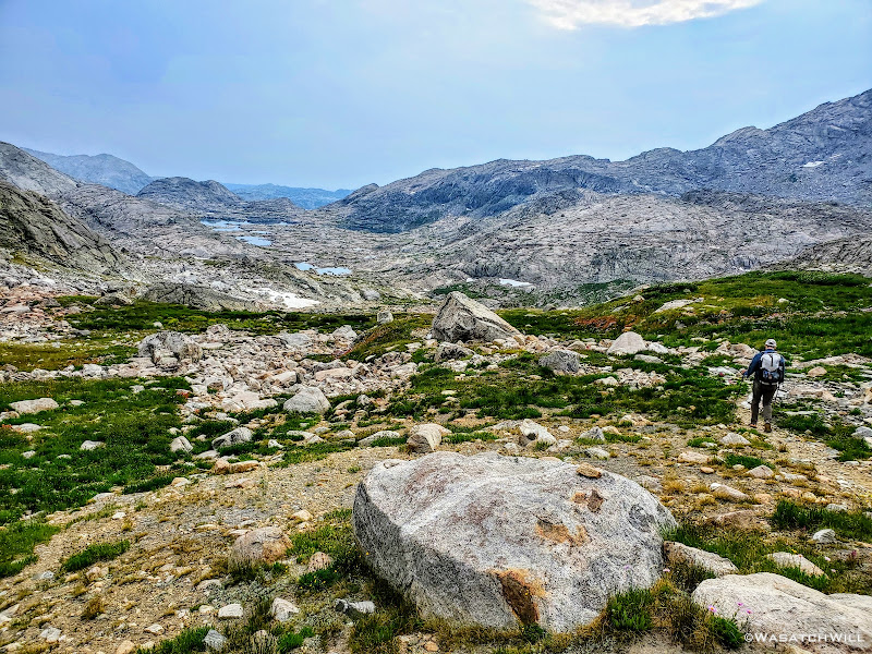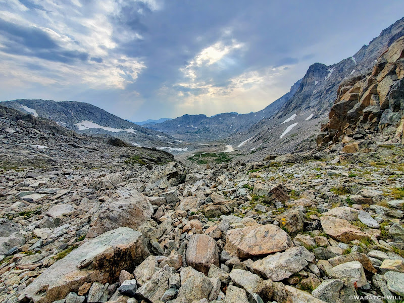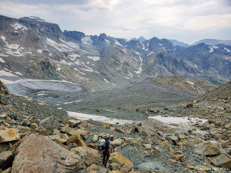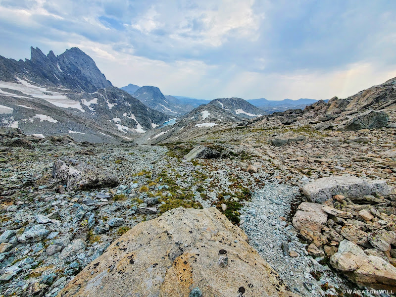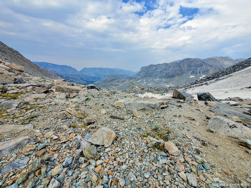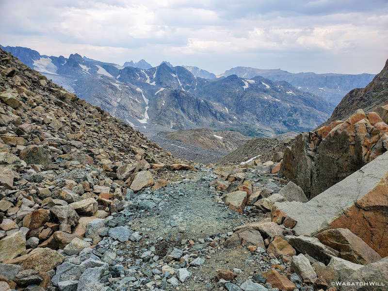 Now out ahead of us lied Indian Basin, and at the end of it, Titcomb Basin. Both bucket list destinations I had longed to see, wanting tosee what all the hype was about them. Just as exciting was the fact that we'd be back on a trail all the way down. Down we went, eager to settle into a site to set up camp somewhere out beyond.