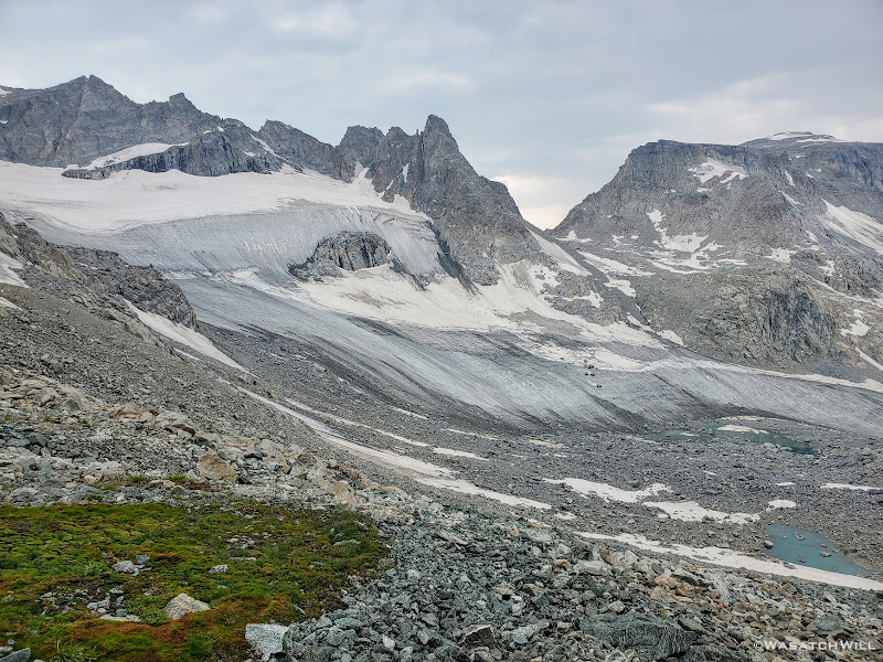 We then told them to cross the outlet and head down from the lake along the opposite side we had mostly come up. They in turn also let us know that Knifepoint Glacier, which awaited us on the other side of Alpine Pass, was not very sketchy at all. That was another key point along the route I was a little concerned about, having never had the experience of stepping foot on a true glacier before.