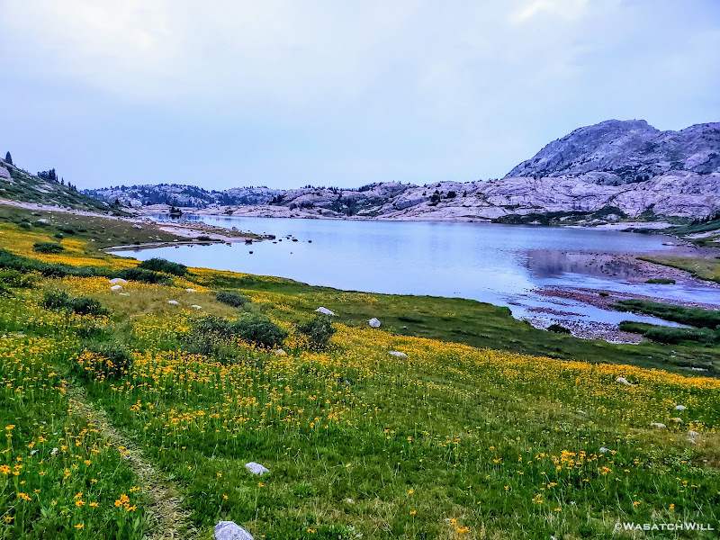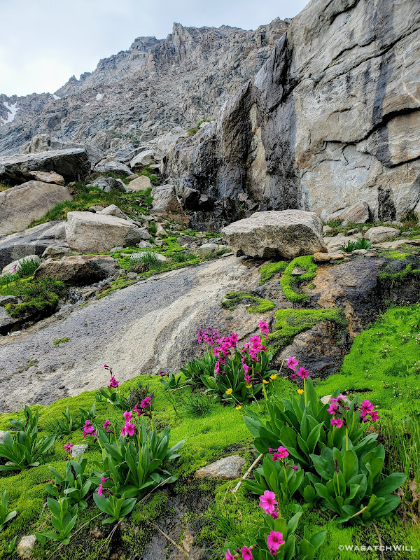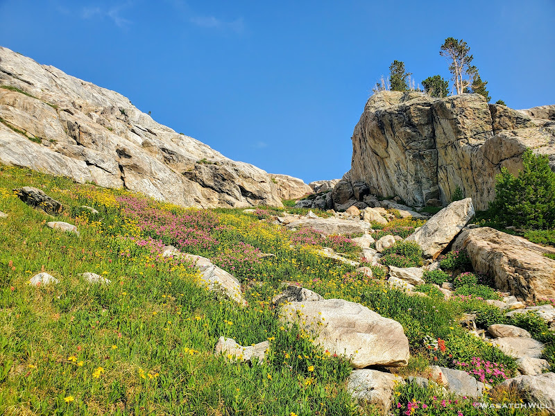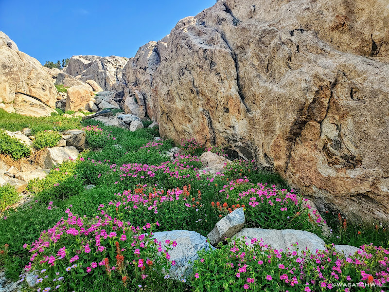 The trail that had led us toward Camp Lake continued along its eastern shore and around to its outlet. Across the outlet, we had a bit of trouble looking for any established pathway up the short rise we had to gain. Eventually we stumbled into what became a use trail that took us the rest of the way over to the small nameless lake where it then vanished into big granite slabs and ramps that would officially take us up into Alpine Lakes Basin. We probed them for a moment and found a weakness in them, a little mini canyon of sorts, that allowed us to prolong having to get up on the granite itself just a little bit more. While we mostly just chose it because it appeared to be a path of least resistance, it also turned out to be filled with flowers which gave it a beautiful and colorful accent.