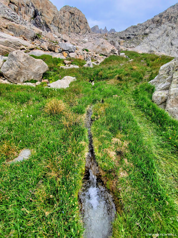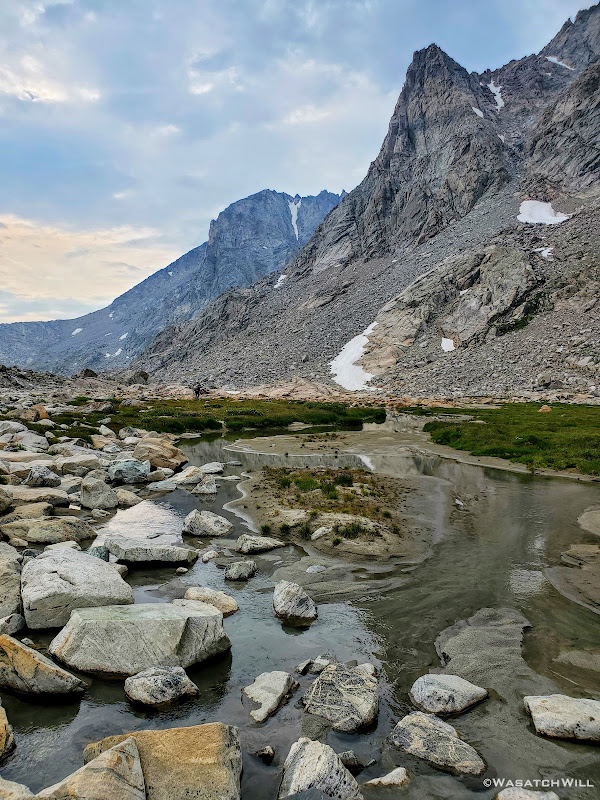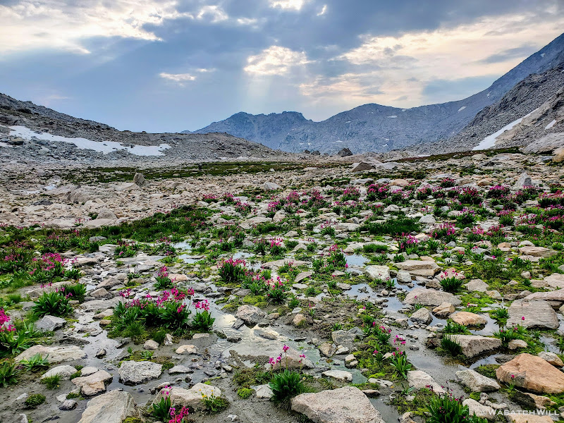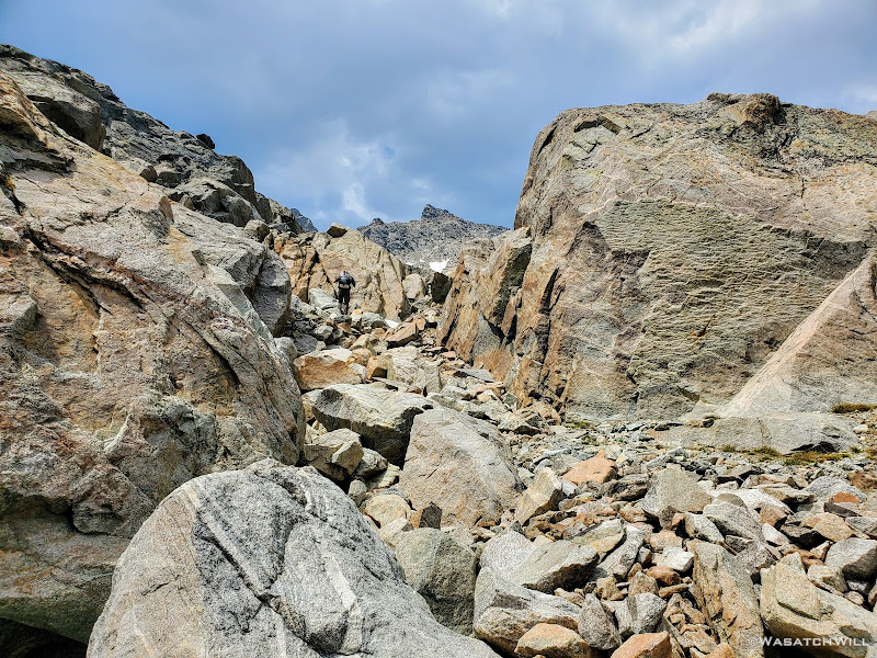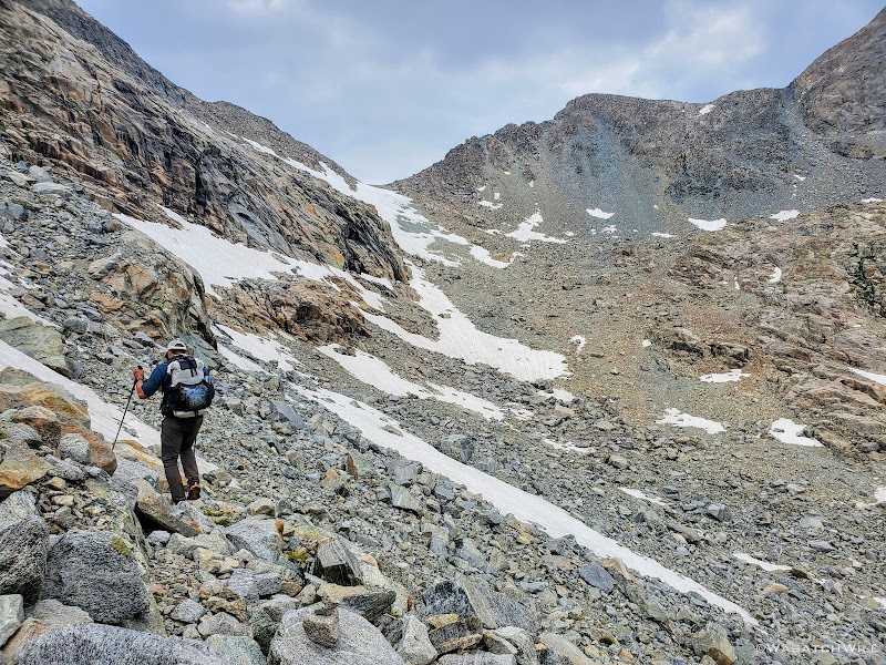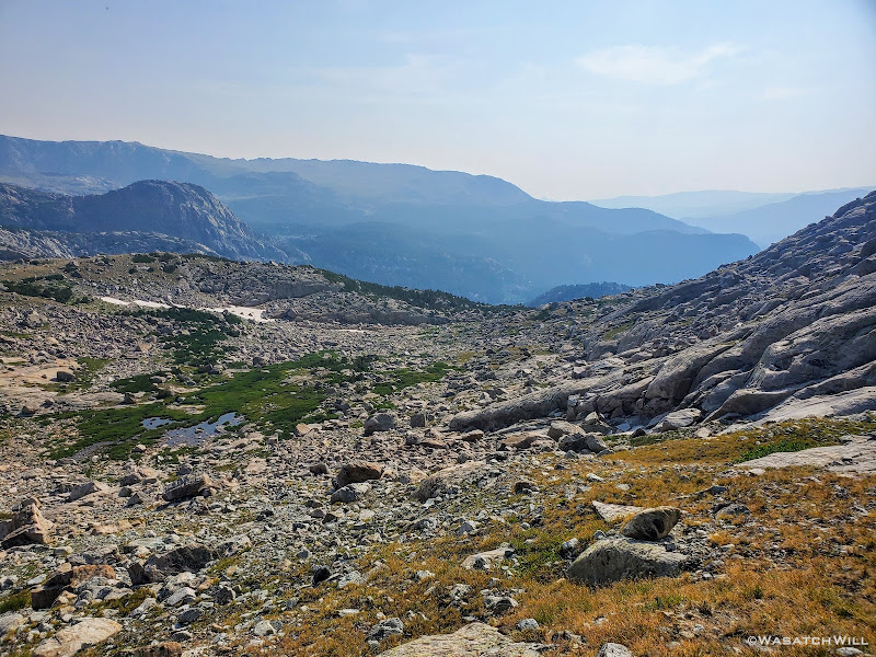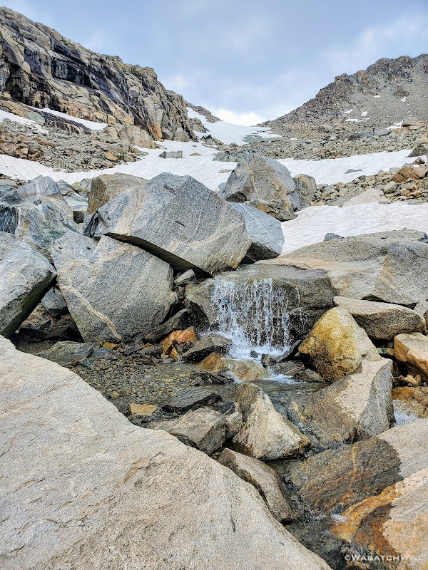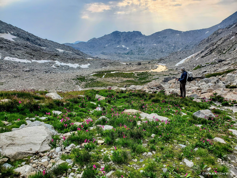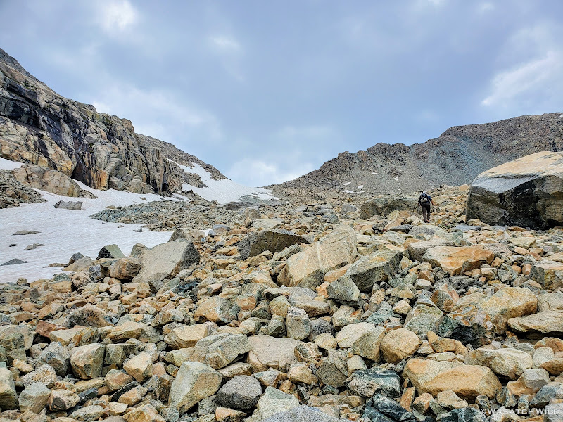 Blake continued on for a bit while I sought out a good spot to top off my water. I was able to wander out to a small creek to do that before rejoining Blake for some more uphill action. This time, instead of smooth granite slabs to continue taking us up however, it was back to talus and tundra. Not so bad, but we were now just eager to get over it and be done with it so we could start making some real progress up through the basin.