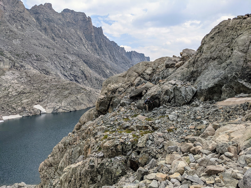 At the end, it joined up the large snowbank that had been draped over the top of this rise along its western edge. At this point we found ourselves exceptionally high above the lake now and things got really steep and loose looking straight ahead and below us. Because of this, things looked more treacherous than they ever had to this point. We even turned around thinking we had reached a dead end in a maze of rock we now found ourselves in, went back up into and onto the rock and sought out any other way we could find down. Nothing better appeared.