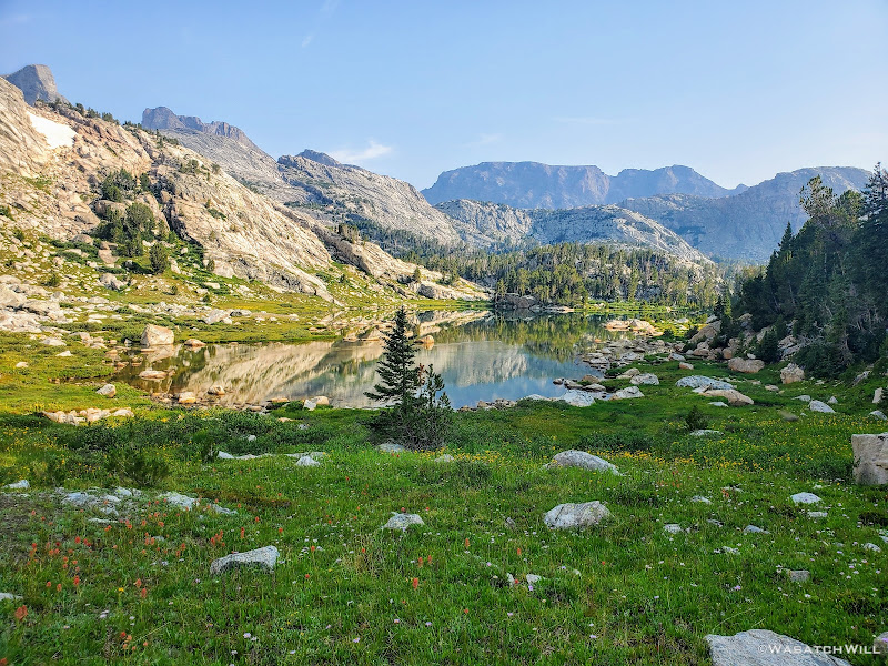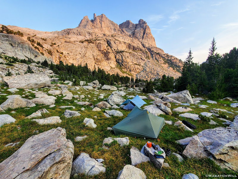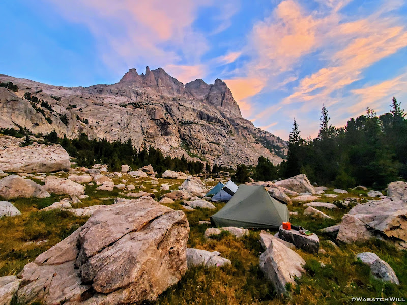 Now with precious little light left again, we went into desperation mode for finding a campsite. We could have veered up into Titcomb, but given how many folks we saw up in Indian Basin we figured it would be pretty crowded up there too. Island Lake, while only a mile away now, felt too far. No doubt it would have been a struggle to find a vacant spot this late in the day there too. We ended pulling over at a small-ish lake that sits at the lower edge of Titcomb Basin and just above Island Lake, Lake 10467. There I had spied an open grassy flat some 300 feet back from the lake and behind a small thicket of trees, a site some 1700 feet lower in elevation than Indian Pass. We hastily got our tents and beds set up just in time to have dinner in the dark again. Only afterwards had we realized another group had ended up near the same spot, not much more than 200 feet away from us. Oops. Even at 200 feet away, I felt like we were camping on top of them and hoped they weren't too bothered by it. At least we had the thicket of trees along with a little rise in elevation to keep our camps mostly out of view from each other.