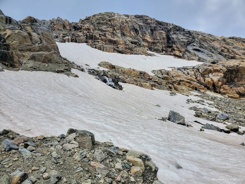 From the direction we were coming from it became apparent that we actually had two viable ways up and over the final rise we needed to go over in order to make it around to the other side of the lake where the base of Alpine Pass stood waiting for us. One was of course to follow the footsteps and slide marks of the other two guys we had just seen as they went further up what would become a steep snowbank, especially on the other side. The other way was up through a weakness in the ledge beneath the snowbank where it became another little mini canyon of sorts. It was littered with rubble that we were able to treat as stairs, albeit a loose spot or two.