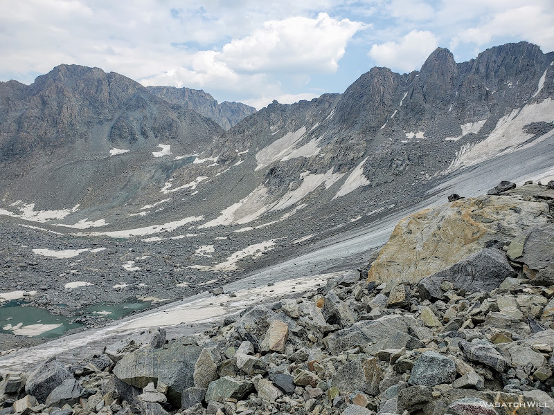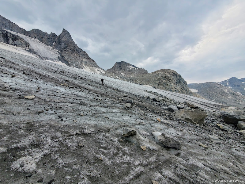 So, we resorted to returning to the snow. To head north again, we had to descend, er, perform a controlled slide down a steep downslope to get back down into the talus below. It still wasn't looking great because now we were looking down a steep and slippery looking chute straight below us. Blake proceeded down a couple short little ledges immediately below us and then scouted out around a blind corner while I stayed back and crossed my fingers and marveled at how well his ankle had been holding up thus far. A moment later, he returned and reported that he was able to sight out a nice and gradual (i.e. stable) line along the contour of the rocky slope out to the left and then into a soft yet somewhat stable looking moraine well below a small glacier clinging high up above.