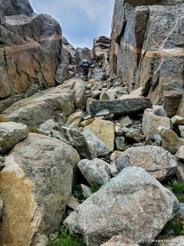 In hindsight, it had turned out to not be the best way. We ended up scrambling through some of the largest boulders we'd ever encounter on this trip trying to gain the next rise where the uppermost lake rested. It turned out to be quite an obstacle course and slowed us down considerably. As we were picking our way through, over, and around the ginormous rocks, some being the size of large automobiles and even tiny homes, we heard some voices trailing behind us. We paused and looked back to see what appeared to be the same group of four we had encountered the previous two days down below and beginning to work their own way up. However, they were not following right behind us. They had crossed over the creek and were heading up its north side. It turned out that there were no such large boulders on that side. Only grassy slopes and rocky ramps with much smaller rocks and boulders littering that side. Doh!!! I made a mental note of that in case I ever find myself combing through this semi-treacherous place again.