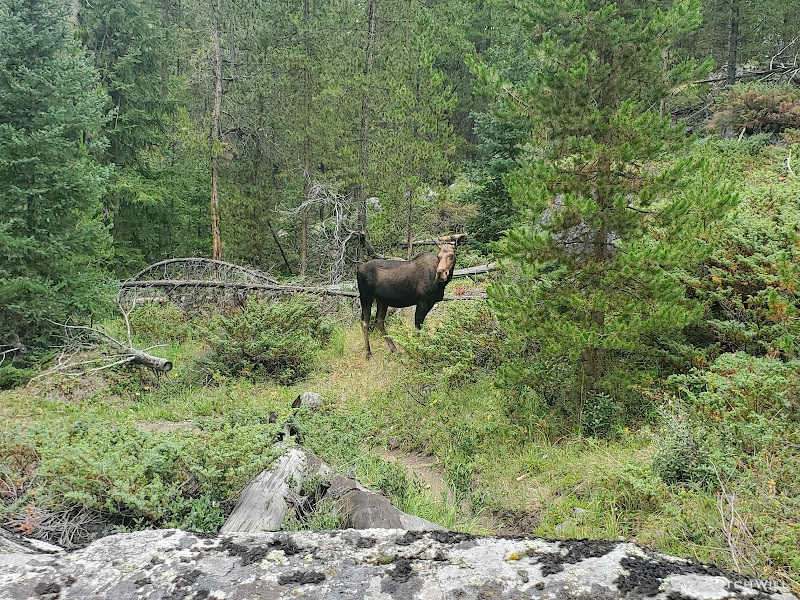 Between the upper and lower of the Green Lakes, we finally got to see our first wildlife sighting of an animal larger than a marmot, a moose cow. Content to occupy the trail while it continued to eat its lunch, we ended up surrendering the trail and veering off to scramble over some down logs followed by a bit of bushwhacking to get around the moose and back on trail beyond it.