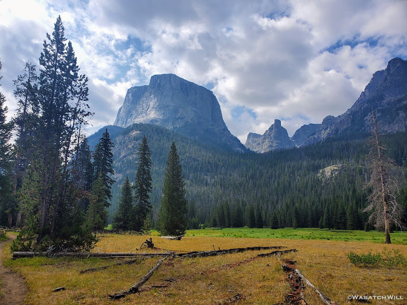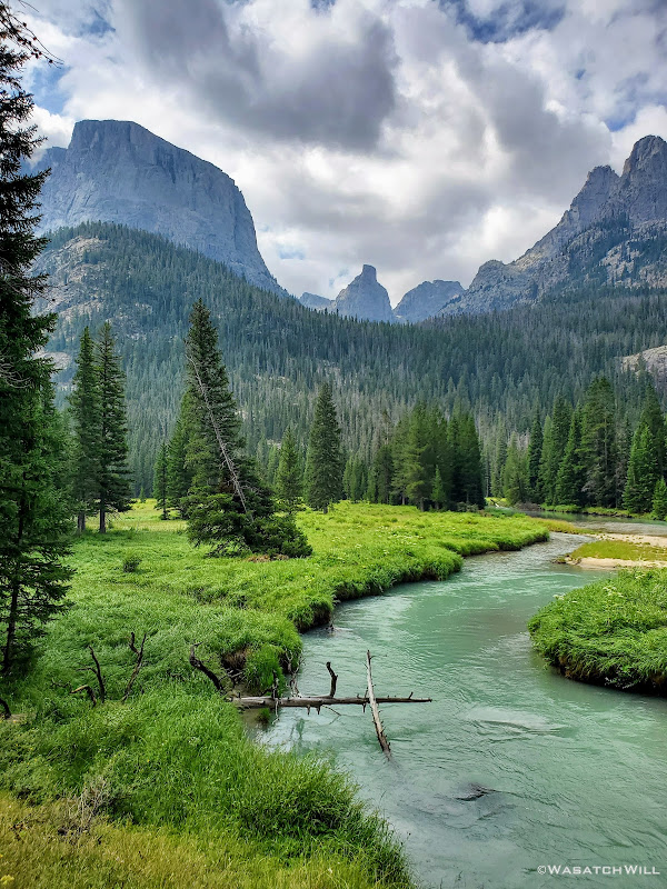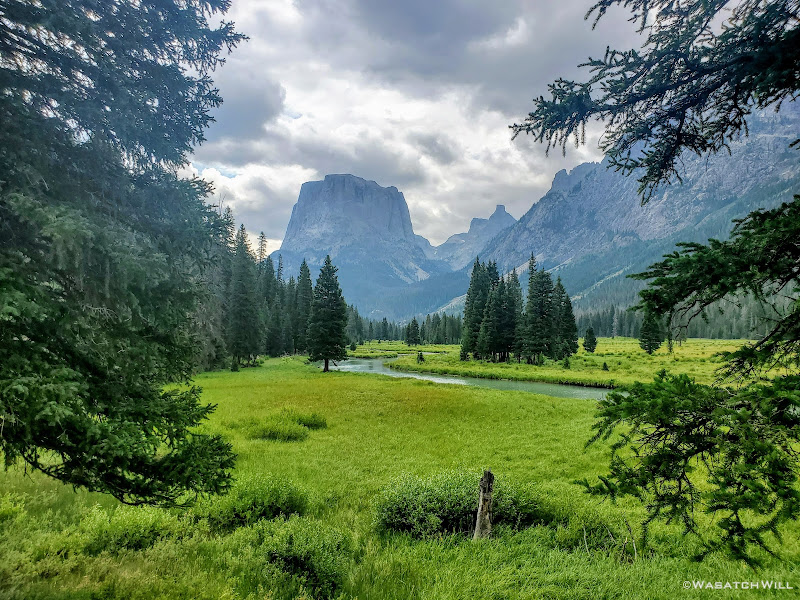 After drifting through the forest for a good bit, we emerged into more clearings where we could now look back up and start to see the more typical view of Squaretop Mountain from the north. This would be a prominent landmark to look back upon for the remainder of our course. The Green River also continued to meander on through lush green meadows as it made its way for the two large lakes sharing the same namesake.