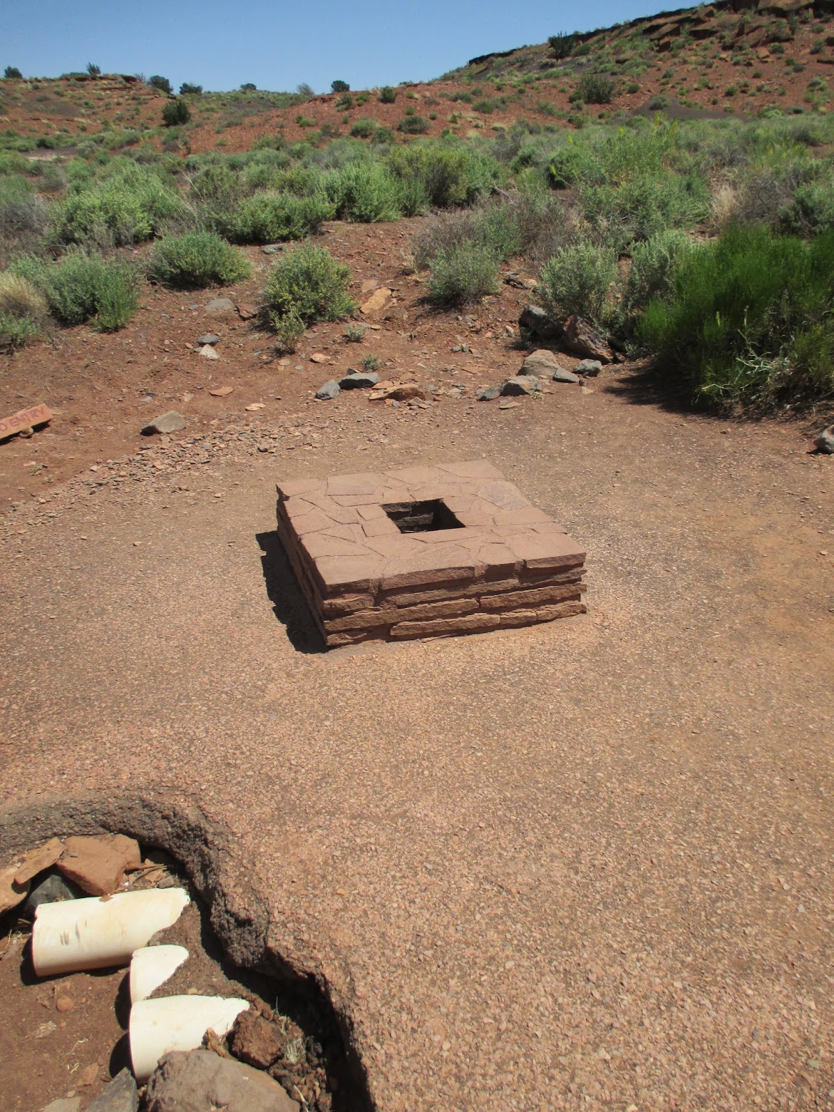 The end of the trail at Wupatki goes past a ball court to a blowhole, where essentially a cavity in the rock, basically a cave that's too small to crawl into, is located. The blowhole was putting out cold air when we were there. It was fun to sit next to it and put our hands over the opening to feel the cool air coming out.