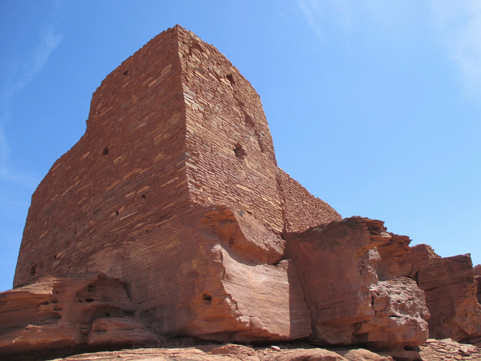 Wukoki is built on a large sandstone boulder. The ruin and the courtyard cover the entire top of the boulder. Large walls rise from the east side, forming several rooms. It's a short hike from the parking area and is well worth your time. We went up into the ruin, as well as encircling the outside of it on a small footpath.