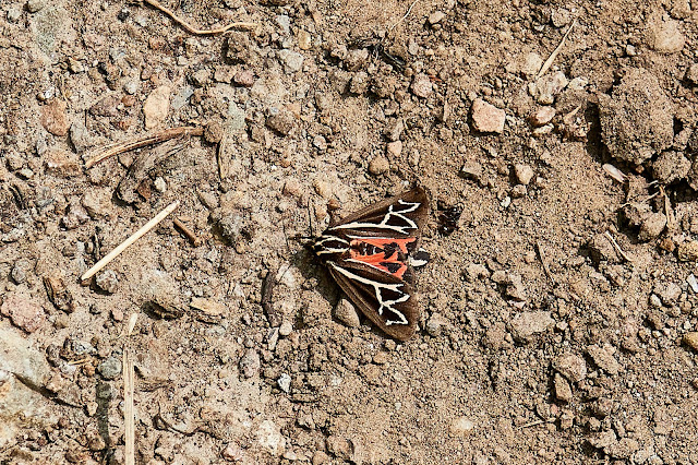 At one point, I caught up to Dave and we waited for Hugh to catch up. After a little bit, Dave left his pack with me and backtracked to find Hugh. We had been talking about a cutoff trail that was on the map and Hugh had made a turn a little too early. While I was waiting for the two of them I found this moth ...