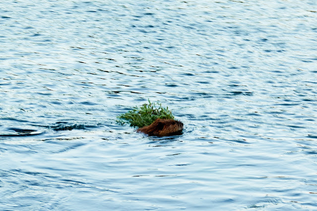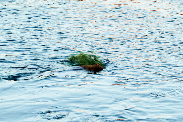 After dinner Bob and Hugh had crawled into bed, Dave and I were sitting next to the river hoping to see a bear or a wolf on the other side. I noticed a branch with leaves floating and then realized that there was an animal as well. I pointed it out to Dave and tried to get a photo.